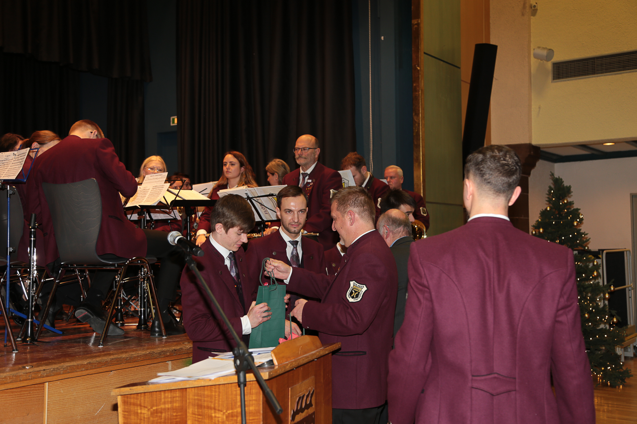 Danach kam mit Leoni Hoffmann die zweite Dirigentin auf die Bühne – und damit auch die Jugendkapelle. Nach einigen Weihnachtsliedern und Titel wie „Lord of the Rings“ übernahm der Schirmherr der Jugendkapelle Dirk Oestringer das Geschehen und verteilte die Geschenke an die Jugendkapelle. Außerdem wurden noch die Musiker belohnt, die die höchste Probenbeteiligung aufweisen konnten.
