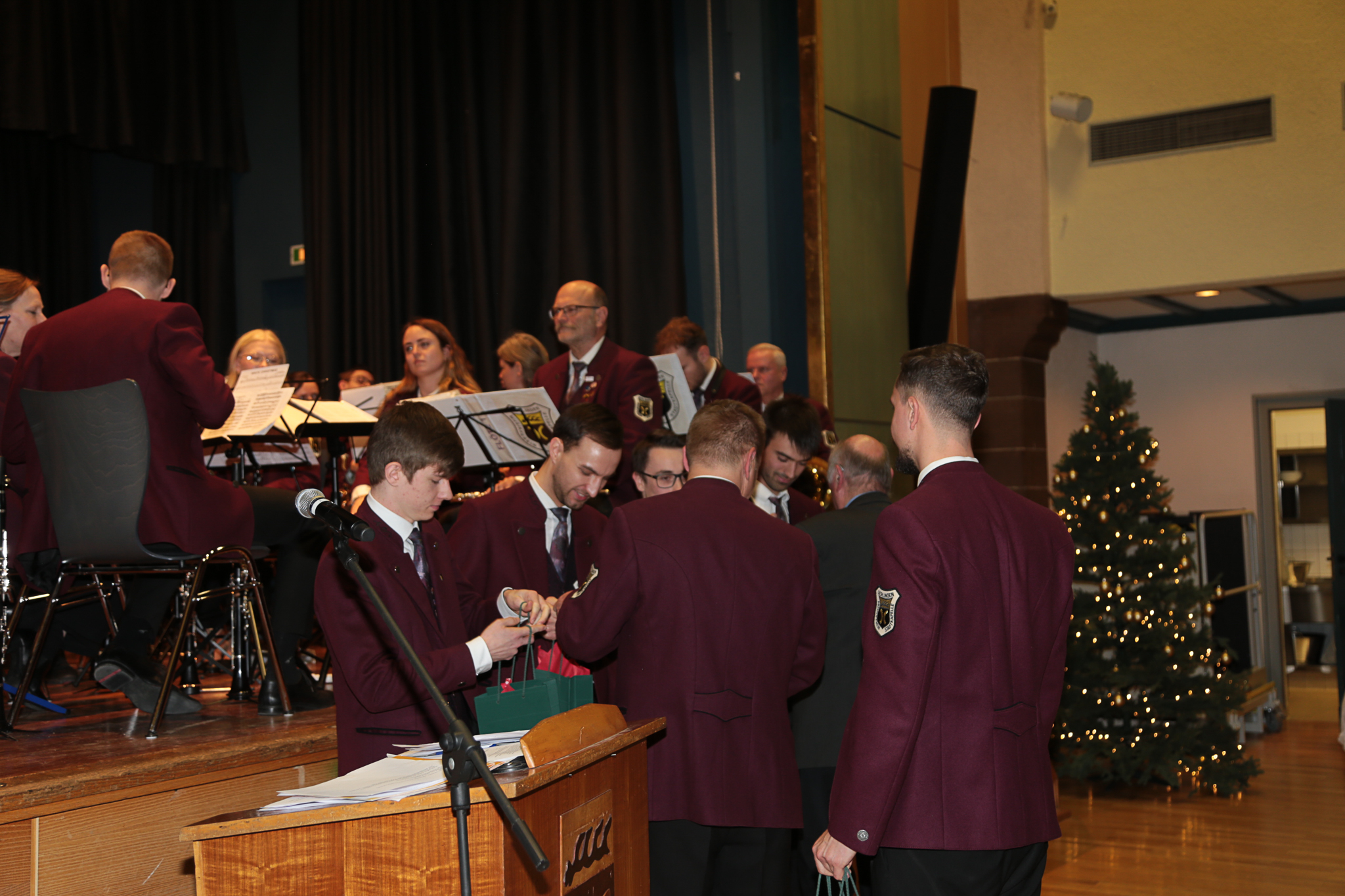 Danach kam mit Leoni Hoffmann die zweite Dirigentin auf die Bühne – und damit auch die Jugendkapelle. Nach einigen Weihnachtsliedern und Titel wie „Lord of the Rings“ übernahm der Schirmherr der Jugendkapelle Dirk Oestringer das Geschehen und verteilte die Geschenke an die Jugendkapelle. Außerdem wurden noch die Musiker belohnt, die die höchste Probenbeteiligung aufweisen konnten.