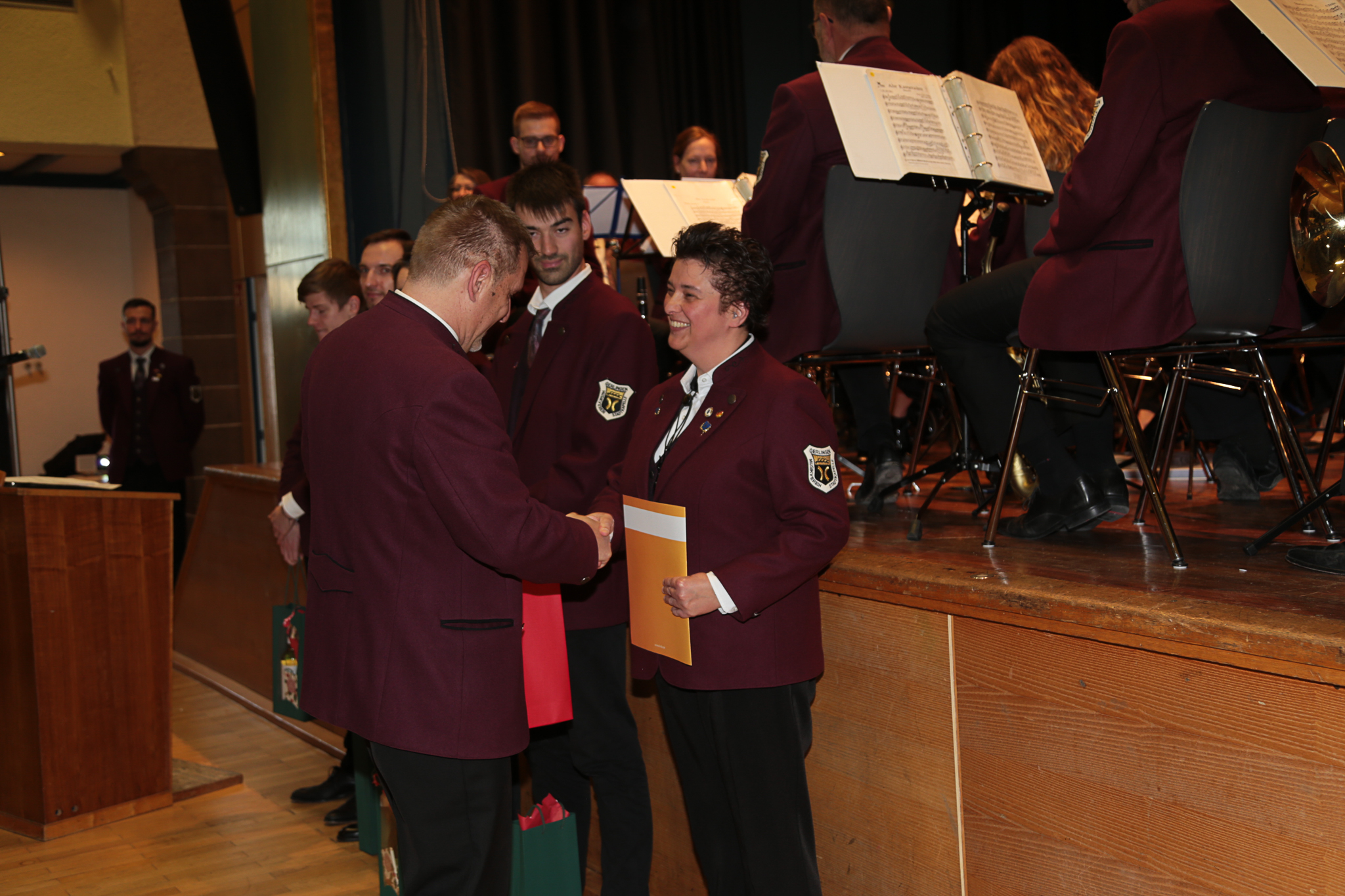 Danach kam mit Leoni Hoffmann die zweite Dirigentin auf die Bühne – und damit auch die Jugendkapelle. Nach einigen Weihnachtsliedern und Titel wie „Lord of the Rings“ übernahm der Schirmherr der Jugendkapelle Dirk Oestringer das Geschehen und verteilte die Geschenke an die Jugendkapelle. Außerdem wurden noch die Musiker belohnt, die die höchste Probenbeteiligung aufweisen konnten.