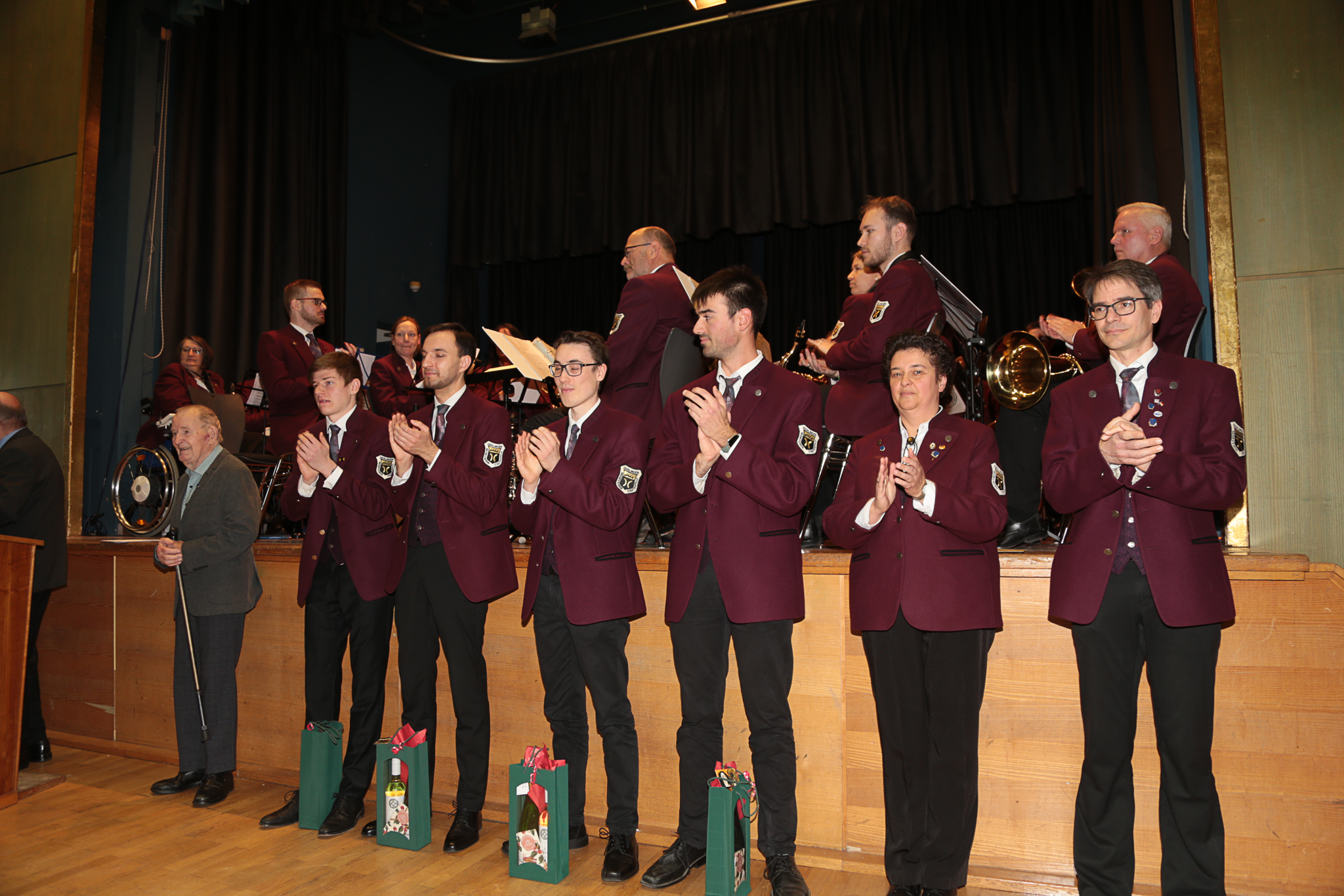 Weiter ging es mit den Ehrungen unser Mitglieder. Für 10 Jahre aktive Mitgliedschaft wurden Chris Wanner, Tim Kröper, Jannik Kaiser und Michael Widmann geehrt. Für 20 Jahre aktive Mitgliedschaft wurde Thomas Imiolczyk geehrt. Für stolze 40 Jahre aktive Mitgliedschaft wurden Daniela Grotzke und Rainer Binck geehrt. Für 40 Jahre fördernde Mitgliedschaft wurde Friedrich Strauß geehrt. Doch ging die höchste Auszeichnung an diesem Abend an unser langjähriges Mitglied Anton Schmidt, der für 75 Jahre (!) fördernde Mitgliedschaft geehrt wurde. Vor Kurzem haben wir noch ein Geburtstagsständle zu seinem 90. Geburtstag gespielt. An dieser Stelle „Herzlichen Glückwunsch“ und natürlich „Herzlichen Dank“ an alle Jubilare für lange Unterstützung, die nicht selbstverständlich ist.