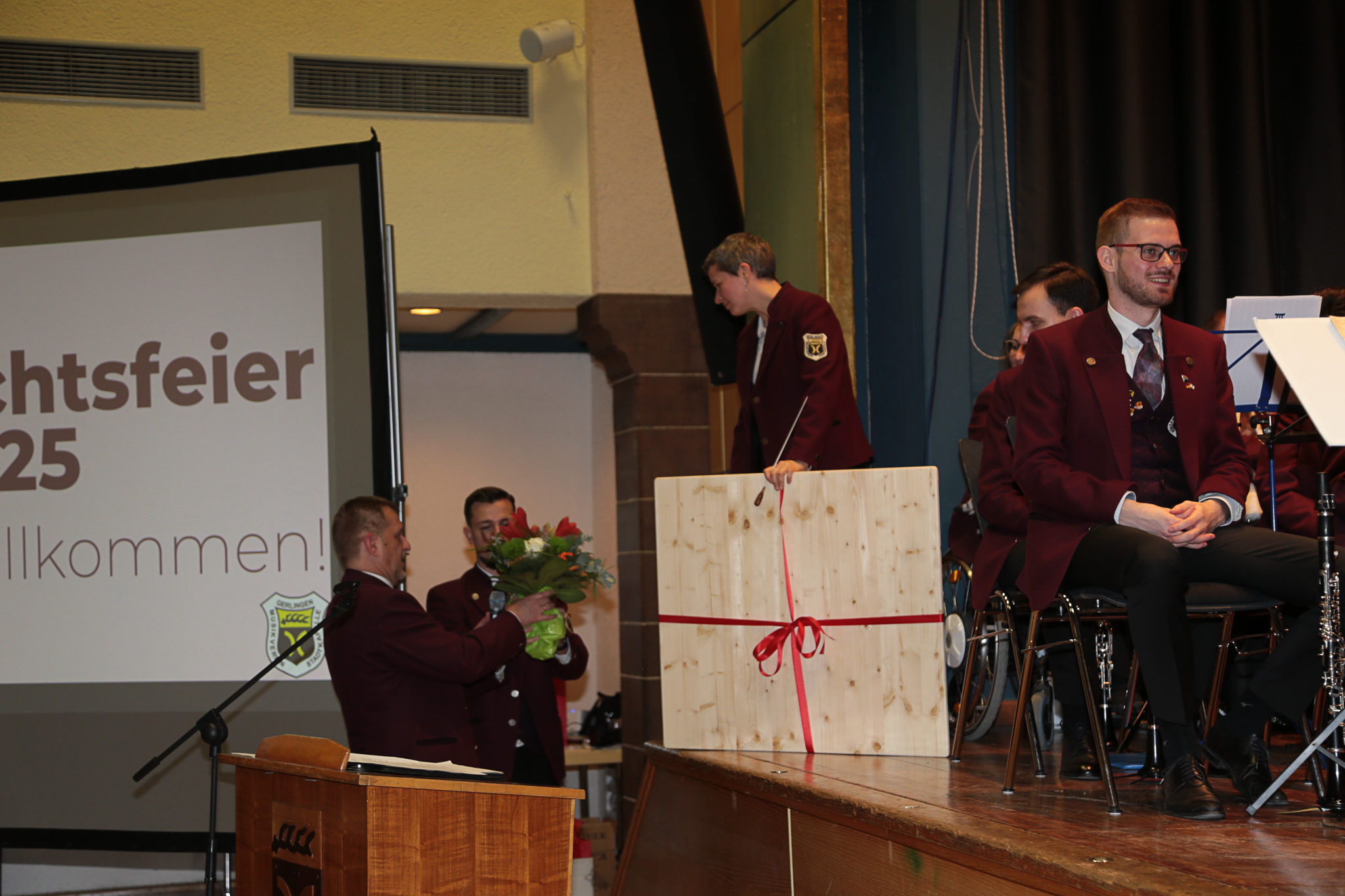 Danach kam mit Leoni Hoffmann die zweite Dirigentin auf die Bühne – und damit auch die Jugendkapelle. Nach einigen Weihnachtsliedern und Titel wie „Lord of the Rings“ übernahm der Schirmherr der Jugendkapelle Dirk Oestringer das Geschehen und verteilte die Geschenke an die Jugendkapelle. Außerdem wurden noch die Musiker belohnt, die die höchste Probenbeteiligung aufweisen konnten.