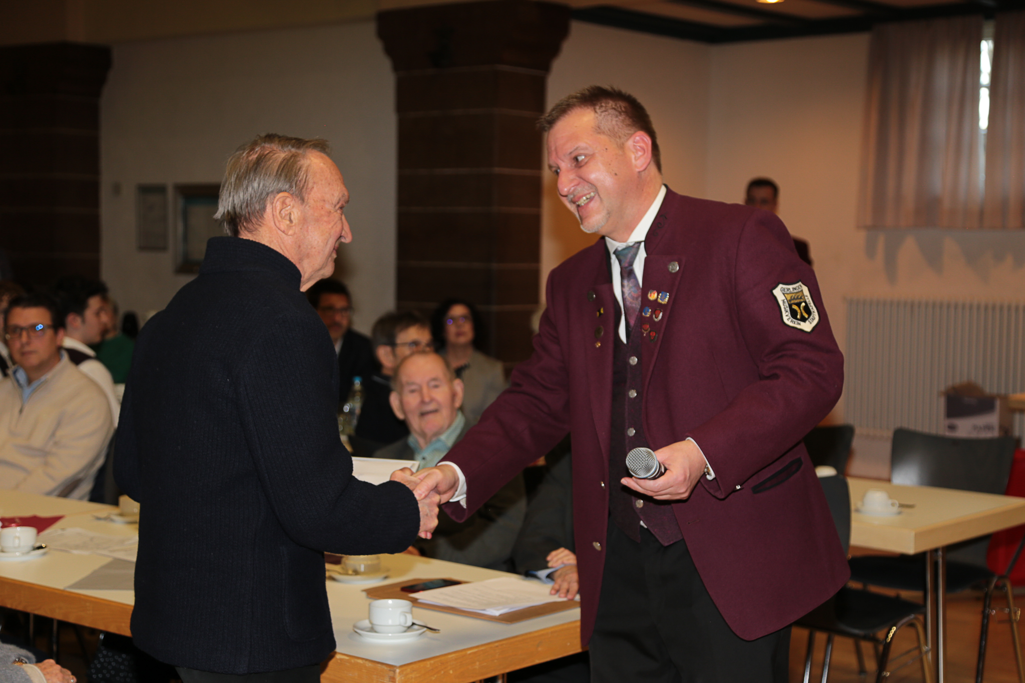 Weiter ging es mit den Ehrungen unser Mitglieder. Für 10 Jahre aktive Mitgliedschaft wurden Chris Wanner, Tim Kröper, Jannik Kaiser und Michael Widmann geehrt. Für 20 Jahre aktive Mitgliedschaft wurde Thomas Imiolczyk geehrt. Für stolze 40 Jahre aktive Mitgliedschaft wurden Daniela Grotzke und Rainer Binck geehrt. Für 40 Jahre fördernde Mitgliedschaft wurde Friedrich Strauß geehrt. Doch ging die höchste Auszeichnung an diesem Abend an unser langjähriges Mitglied Anton Schmidt, der für 75 Jahre (!) fördernde Mitgliedschaft geehrt wurde. Vor Kurzem haben wir noch ein Geburtstagsständle zu seinem 90. Geburtstag gespielt. An dieser Stelle „Herzlichen Glückwunsch“ und natürlich „Herzlichen Dank“ an alle Jubilare für lange Unterstützung, die nicht selbstverständlich ist.