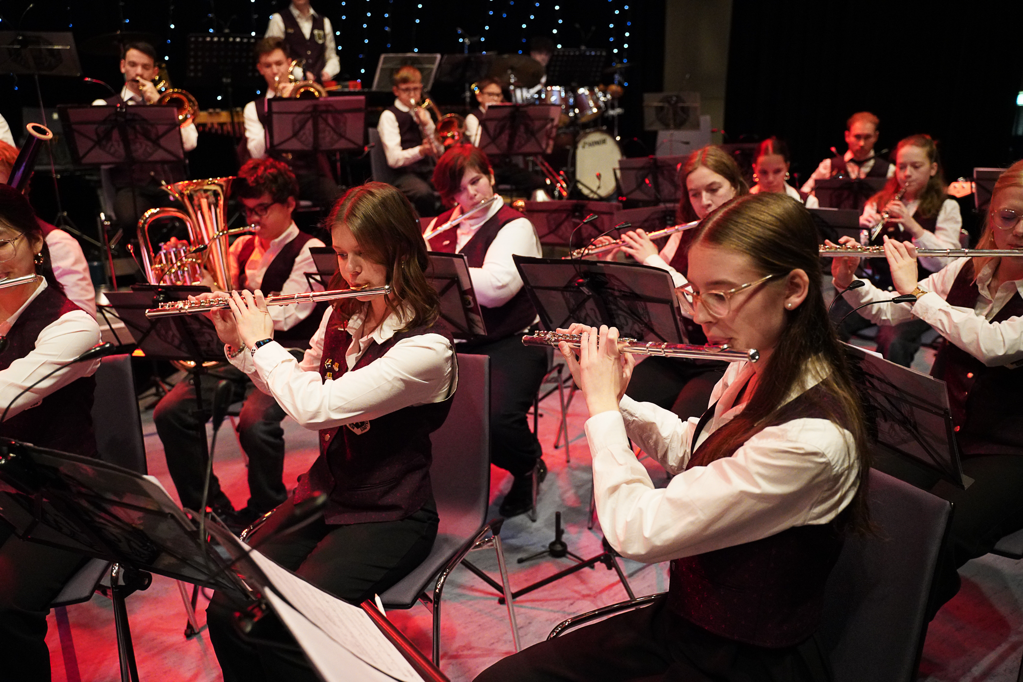 Die musikalische Eröffnung erfolgt wie immer durch die Jugendkapelle – unter der Leitung von Leoni Hoffmann. Der erste Titel des Abends beginnt mit der Textzeile „In München steht ein Hofbräuhaus…“. Der Party-Hit „Skandal im Sperrbezirk“ verfehlt seine Wirkung in der voll besetzten Stadthalle nicht und die Stimmung steigt spürbar. Im Anschluss geht die Reise in den hohen Norden nach Norwegen, charmant anmoderiert von unserer Musikkameradin Sonja Laicher. In Norwegen, genauer gesagt im vergangenen Königreich Arendelle, treffen wir Elsa und ihre Freunde und erfahren die wahre Herkunft der magischen Kräfte. Die Highlights aus dem Film „Frozen II“ werden gekonnt vorgetragen. Der Titel „Somewhere“ – vielen bekannt aus dem Musical „West Side Story“ wird als nächstes gespielt. Das Musical erzählt die Liebesgeschichte von Tony und Maria, die sich ineinander verlieben, obwohl sie jeweils zur verfeindeten Gang gehören. Mit „Sirens“ startet direkt der nächste Titel. „Sirens“ beschreibt die Abenteuer des Piraten Fang und seiner Crew, die von einer Sirene auf eine Insel gelockt werden und von Ungeheuern und Dämonen angegriffen werden.