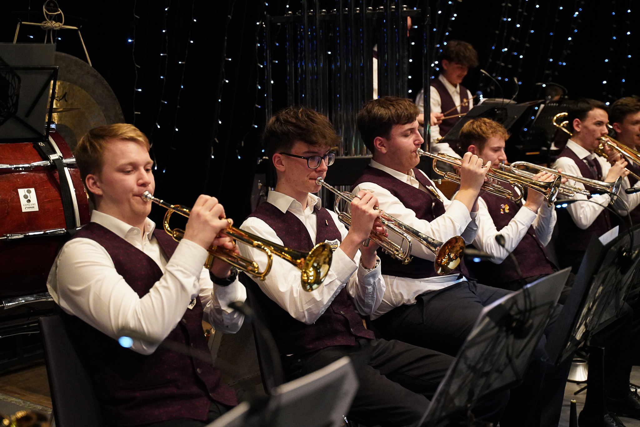 Die musikalische Eröffnung erfolgt wie immer durch die Jugendkapelle – unter der Leitung von Leoni Hoffmann. Der erste Titel des Abends beginnt mit der Textzeile „In München steht ein Hofbräuhaus…“. Der Party-Hit „Skandal im Sperrbezirk“ verfehlt seine Wirkung in der voll besetzten Stadthalle nicht und die Stimmung steigt spürbar. Im Anschluss geht die Reise in den hohen Norden nach Norwegen, charmant anmoderiert von unserer Musikkameradin Sonja Laicher. In Norwegen, genauer gesagt im vergangenen Königreich Arendelle, treffen wir Elsa und ihre Freunde und erfahren die wahre Herkunft der magischen Kräfte. Die Highlights aus dem Film „Frozen II“ werden gekonnt vorgetragen. Der Titel „Somewhere“ – vielen bekannt aus dem Musical „West Side Story“ wird als nächstes gespielt. Das Musical erzählt die Liebesgeschichte von Tony und Maria, die sich ineinander verlieben, obwohl sie jeweils zur verfeindeten Gang gehören. Mit „Sirens“ startet direkt der nächste Titel. „Sirens“ beschreibt die Abenteuer des Piraten Fang und seiner Crew, die von einer Sirene auf eine Insel gelockt werden und von Ungeheuern und Dämonen angegriffen werden.