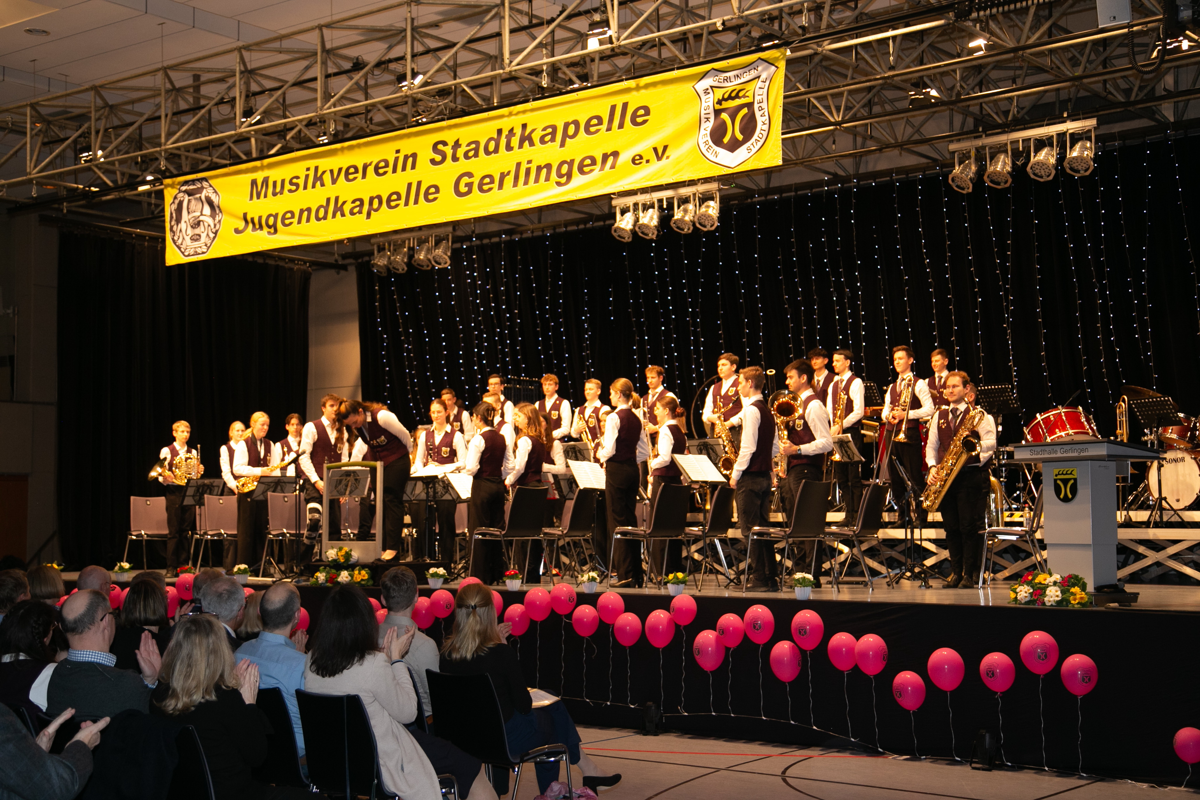 Mit Leoni Hoffmann konnte der 1. Vorsitzende Matthias Widmann in seiner Eröffnungsrede unsere neue Dirigentin der Jugendkapelle vorstellen. Sie ist seit langer Zeit Jugendleiterin und hat nun auch die musikalischen Aufgaben der Jugendkapelle übernommen. Passend zum Konzertmotto „Zwischen Himmel und Erde“ eröffnete die JuKa auch gleich mit John Williams‘ „Out of this World“ den musikalischen Abend in einer sehr gut gefüllten Stadthalle. Doch das tatsächliche Highlight wurde mit dem Stück „Trombone Concertino“ gesetzt – hier hat Clemens Merkle mit seinem auswendig gespielten (!) Posaunensolo eine echte Marke gesetzt. Respekt. Mit weiteren Titeln wie „Dakota“ und „Heroes of the Marvel Universe“ bestätigte die Juka ihr Können. Mit der Zugabe „99 Luftballons“ endete der erste Teil des Frühjahrskonzerts und die Jugendkapelle ließ tatsächlich zum Abschluss noch Luftballons steigen.