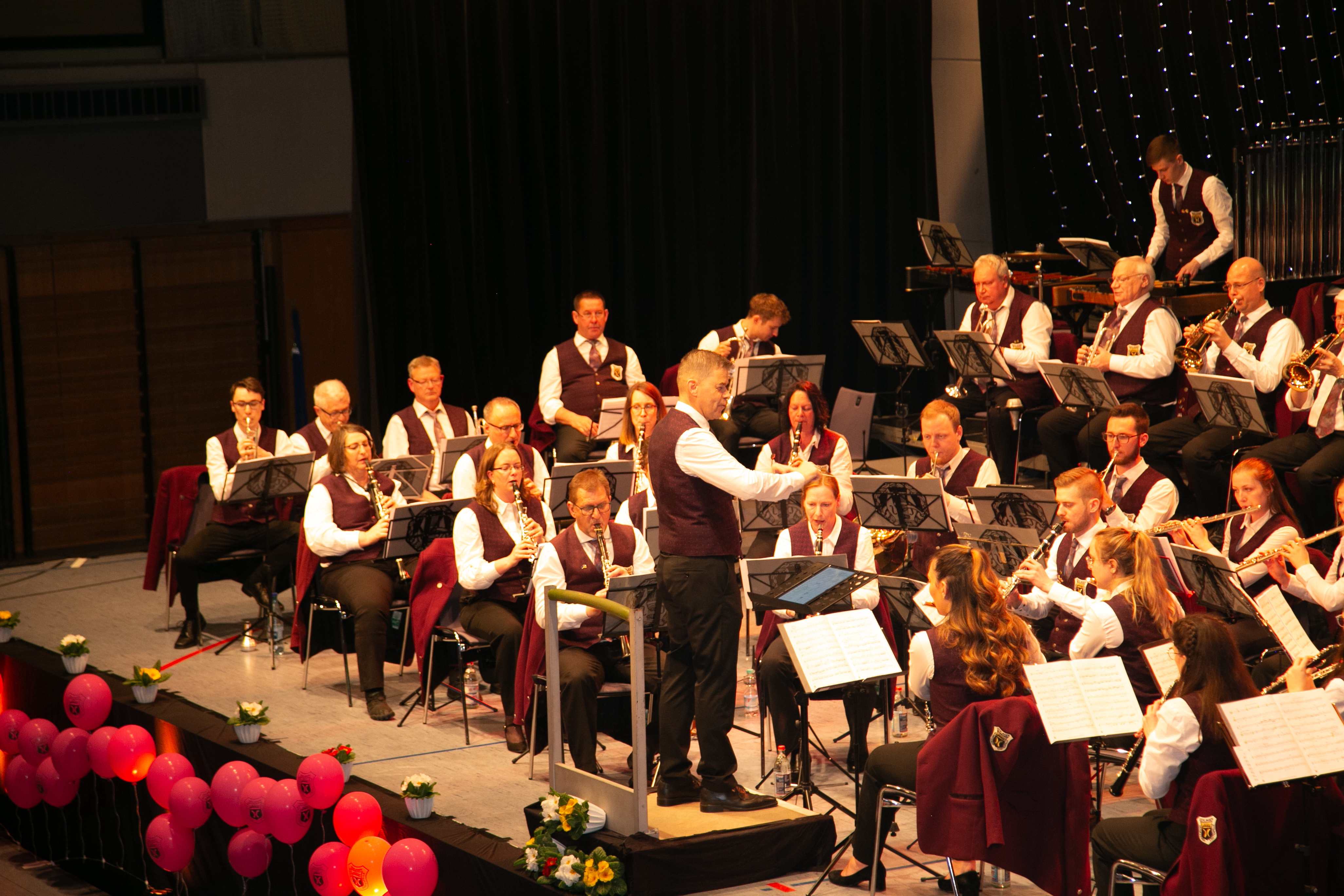 Mit Leoni Hoffmann konnte der 1. Vorsitzende Matthias Widmann in seiner Eröffnungsrede unsere neue Dirigentin der Jugendkapelle vorstellen. Sie ist seit langer Zeit Jugendleiterin und hat nun auch die musikalischen Aufgaben der Jugendkapelle übernommen. Passend zum Konzertmotto „Zwischen Himmel und Erde“ eröffnete die JuKa auch gleich mit John Williams‘ „Out of this World“ den musikalischen Abend in einer sehr gut gefüllten Stadthalle. Doch das tatsächliche Highlight wurde mit dem Stück „Trombone Concertino“ gesetzt – hier hat Clemens Merkle mit seinem auswendig gespielten (!) Posaunensolo eine echte Marke gesetzt. Respekt. Mit weiteren Titeln wie „Dakota“ und „Heroes of the Marvel Universe“ bestätigte die Juka ihr Können. Mit der Zugabe „99 Luftballons“ endete der erste Teil des Frühjahrskonzerts und die Jugendkapelle ließ tatsächlich zum Abschluss noch Luftballons steigen.