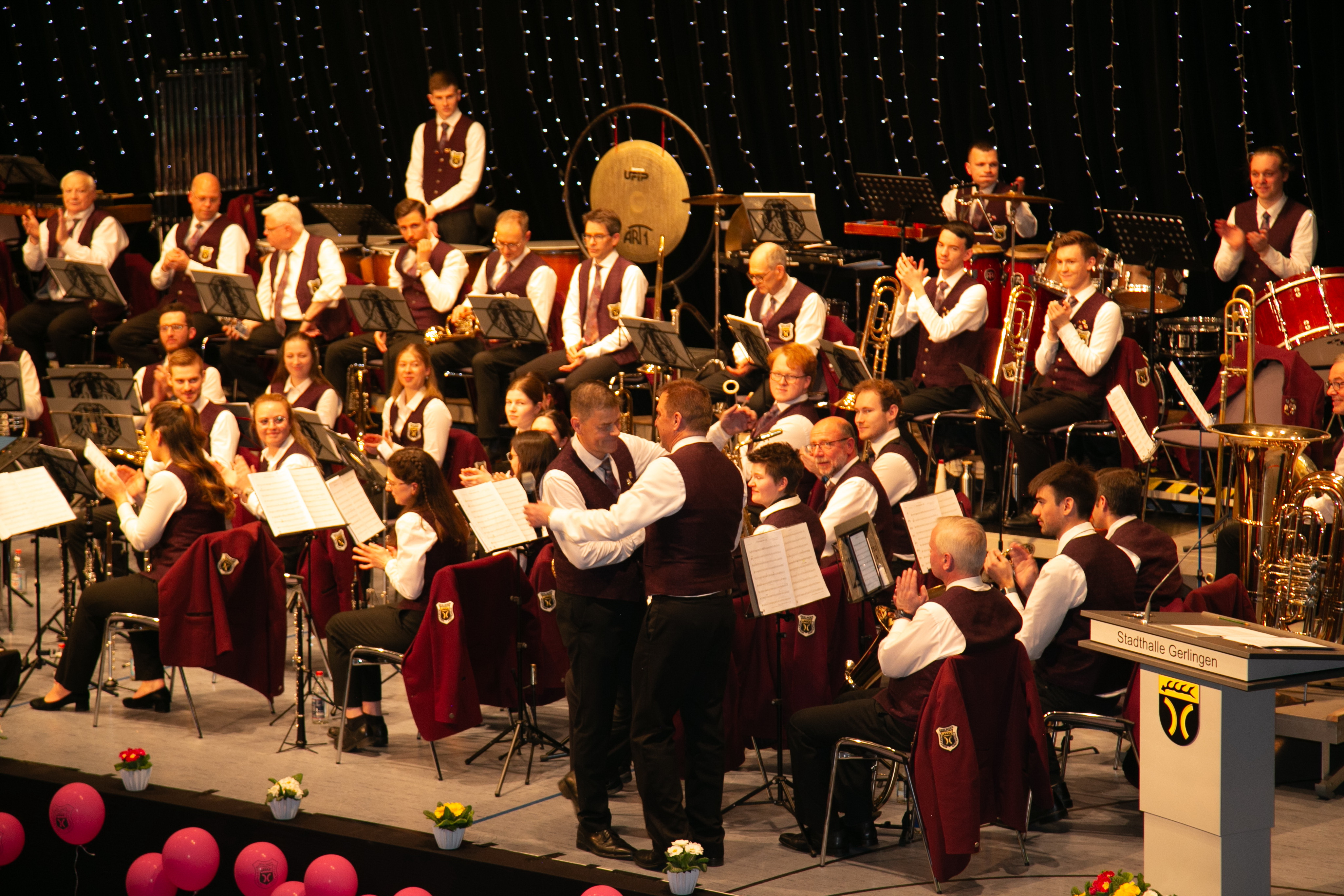 Nach der Pause setzte die Stadtkapelle den musikalischen Abend mit „Fat Bottomed Girls“ fort. Die musikalische Leitung hat Musikkamerad Herrmann Röser übernommen. Er hat die Nachfolge von Maximilian Broichhaus angetreten, bis ein neuer Dirigent für die Stadtkapelle gefunden ist. „Red Rock Mountain“, „Troll Dance“ und „First Suite“ waren weitere Titel, die gekonnt vorgetragen wurden. Mit unserem Solisten Markus Grieb am Flügelhorn wurde auch der nächste Titel „Someone Like You“ zu einem echten Gänsehauttitel. Mit „American Graffity“ und der „Almtaler Polka“ war das offizielle Konzertprogramm beendet. Doch der zahlreihe Applaus des Publikums ließ keine Verschnaufpause zu und mit „Roller Coaster“ wurde eine echte Achterbahnfahrt als Zugabe gespielt – natürlich mit dem typischen Kreischen bei der Abfahrt – hervorragend vom Publikum umgesetzt. Die finale Zugabe war der Titel „Füreinander da“, der von den Hutter-Brüdern komponiert wurde. Dieses Stück wurde gemeinsam mit der JuKa gespielt, so dass über 70 Musiker auf der Bühne standen. Was für ein gewaltiges Bild.