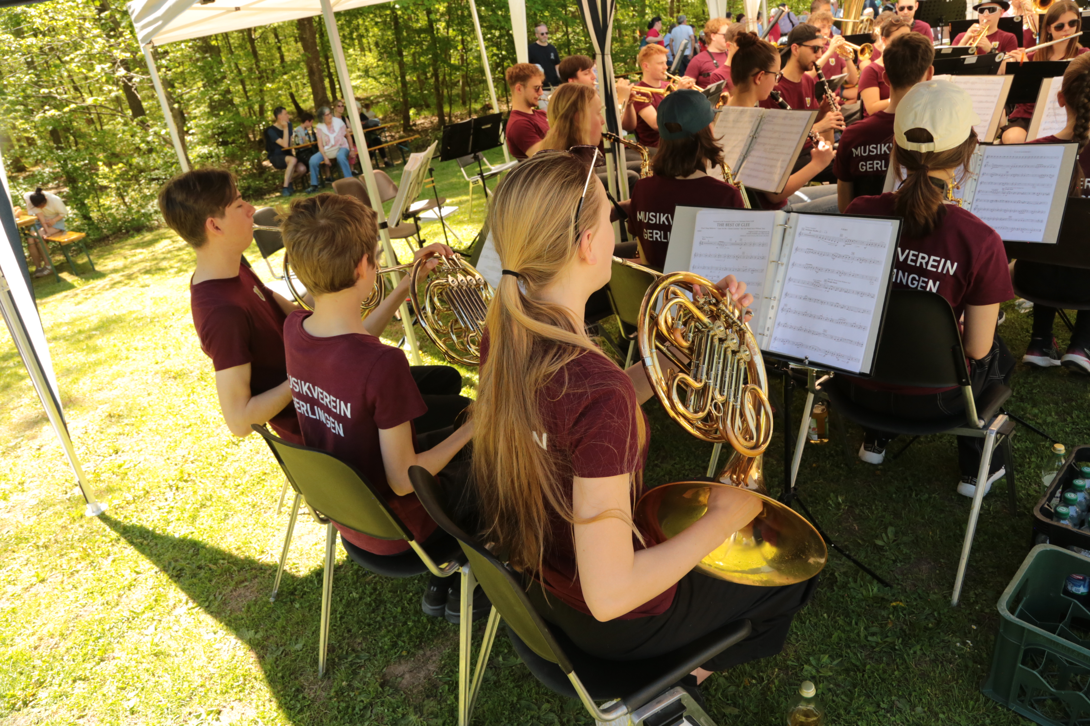 Na? Haben Sie es bemerkt? Korrekt, beide Kapellen des Musikvereins werden nun von Frauen dirigiert – so wie es der 1. Vorsitzende Matthias Widmann am diesjährigen Frühjahrskonzert angekündigt hat. Antonia Efinger hat die musikalische Eröffnung – und auch den Festausklang mit der Stadtkapelle geleitet. Unsere Jugendleiterin Leoni Hoffmann dirigiert die Jugendkapelle. Aber von vorne: Pünktlich um halb zwölf hat die Stadtkapelle den musikalischen Auftakt am Waldfest bei hochsommerlichen Randbedingungen gestartet. Passend mit dem Marsch „Die Sonne geht auf“. Im Anschluss nahm die Jugendkapelle Platz und führte die Unterhaltung der zahlreichen Besucher fort. Dank hervorragender Planung des Wirtschaftsteams um Miriam Storr konnten alle Besucher gestärkt die Wanderung oder die Radtour fortführen. Neben Pulled Pork wurde zu den Klassikern auch gegrillter Halloumi mit Tomate im Brötchen angeboten. Vielen Dank für alle die Mühen im Vorfeld, die für die meisten Besucher unsichtbar bleiben. Nach der Jugendkapelle hat die Stadtkapelle den musikalischen Ausklang übernommen – unter der Leitung von Antonia Efinger, der ein hervorragender Einstand gelungen ist. Herzlichen Glückwunsch.