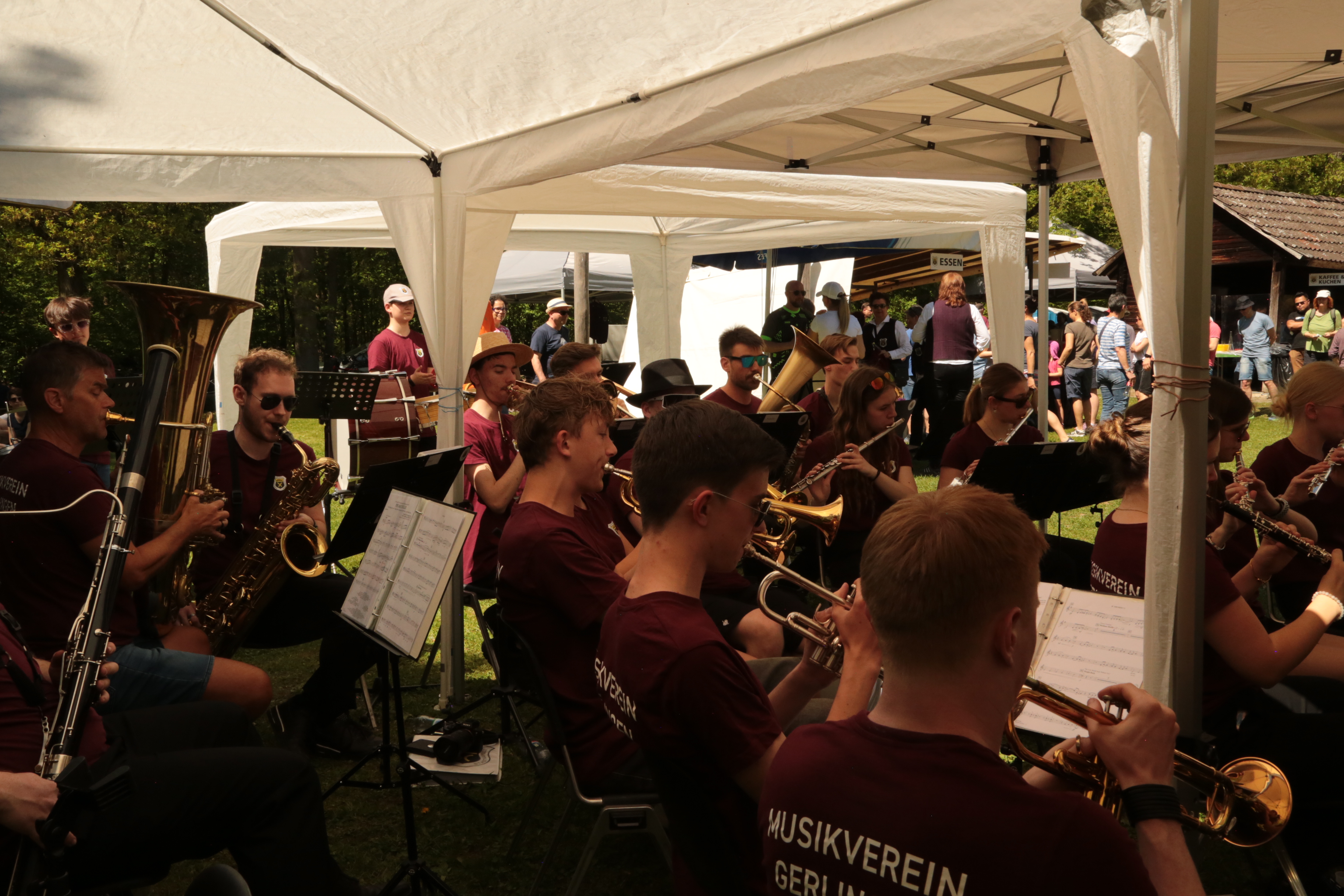 Na? Haben Sie es bemerkt? Korrekt, beide Kapellen des Musikvereins werden nun von Frauen dirigiert – so wie es der 1. Vorsitzende Matthias Widmann am diesjährigen Frühjahrskonzert angekündigt hat. Antonia Efinger hat die musikalische Eröffnung – und auch den Festausklang mit der Stadtkapelle geleitet. Unsere Jugendleiterin Leoni Hoffmann dirigiert die Jugendkapelle. Aber von vorne: Pünktlich um halb zwölf hat die Stadtkapelle den musikalischen Auftakt am Waldfest bei hochsommerlichen Randbedingungen gestartet. Passend mit dem Marsch „Die Sonne geht auf“. Im Anschluss nahm die Jugendkapelle Platz und führte die Unterhaltung der zahlreichen Besucher fort. Dank hervorragender Planung des Wirtschaftsteams um Miriam Storr konnten alle Besucher gestärkt die Wanderung oder die Radtour fortführen. Neben Pulled Pork wurde zu den Klassikern auch gegrillter Halloumi mit Tomate im Brötchen angeboten. Vielen Dank für alle die Mühen im Vorfeld, die für die meisten Besucher unsichtbar bleiben. Nach der Jugendkapelle hat die Stadtkapelle den musikalischen Ausklang übernommen – unter der Leitung von Antonia Efinger, der ein hervorragender Einstand gelungen ist. Herzlichen Glückwunsch.