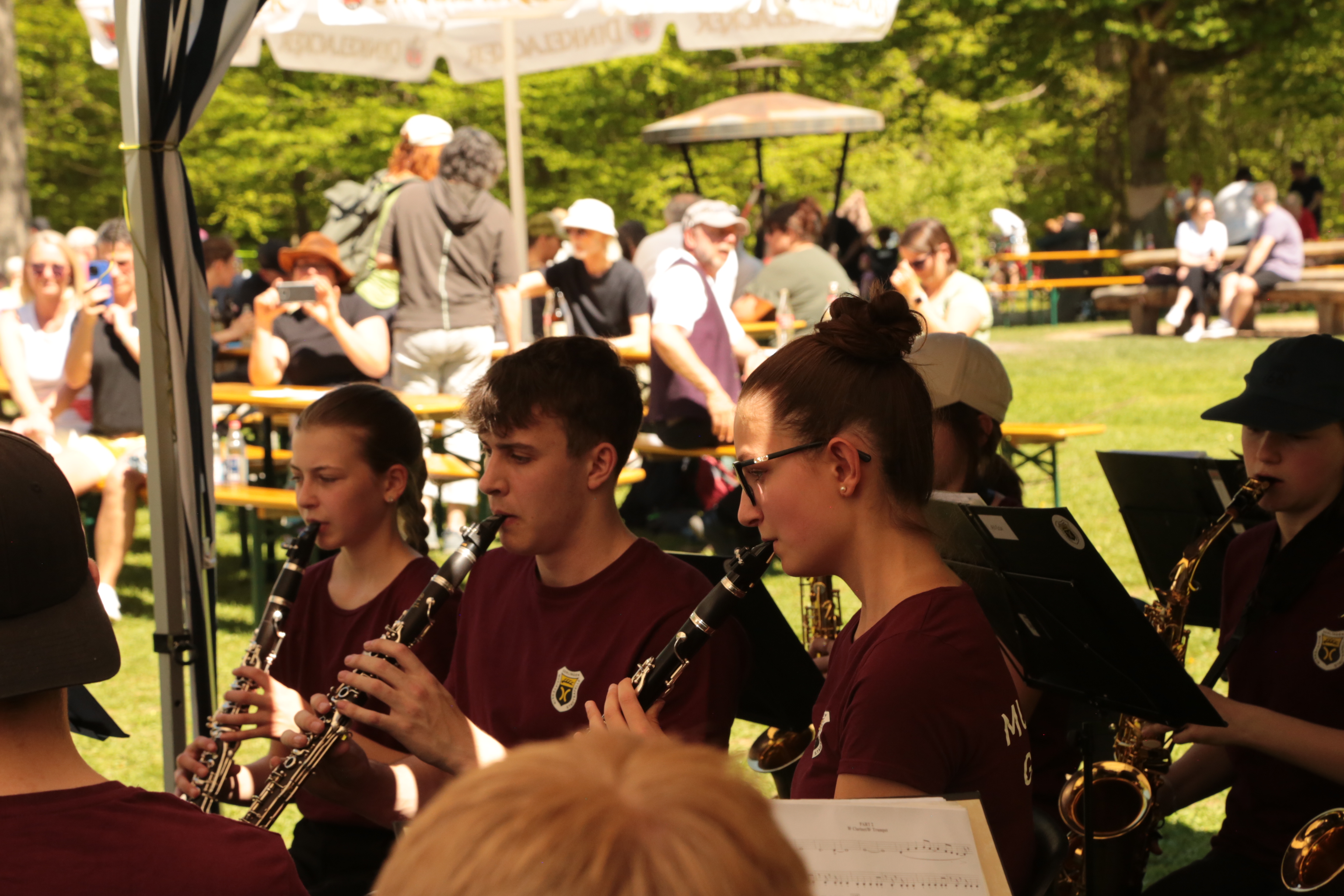 Na? Haben Sie es bemerkt? Korrekt, beide Kapellen des Musikvereins werden nun von Frauen dirigiert – so wie es der 1. Vorsitzende Matthias Widmann am diesjährigen Frühjahrskonzert angekündigt hat. Antonia Efinger hat die musikalische Eröffnung – und auch den Festausklang mit der Stadtkapelle geleitet. Unsere Jugendleiterin Leoni Hoffmann dirigiert die Jugendkapelle. Aber von vorne: Pünktlich um halb zwölf hat die Stadtkapelle den musikalischen Auftakt am Waldfest bei hochsommerlichen Randbedingungen gestartet. Passend mit dem Marsch „Die Sonne geht auf“. Im Anschluss nahm die Jugendkapelle Platz und führte die Unterhaltung der zahlreichen Besucher fort. Dank hervorragender Planung des Wirtschaftsteams um Miriam Storr konnten alle Besucher gestärkt die Wanderung oder die Radtour fortführen. Neben Pulled Pork wurde zu den Klassikern auch gegrillter Halloumi mit Tomate im Brötchen angeboten. Vielen Dank für alle die Mühen im Vorfeld, die für die meisten Besucher unsichtbar bleiben. Nach der Jugendkapelle hat die Stadtkapelle den musikalischen Ausklang übernommen – unter der Leitung von Antonia Efinger, der ein hervorragender Einstand gelungen ist. Herzlichen Glückwunsch.