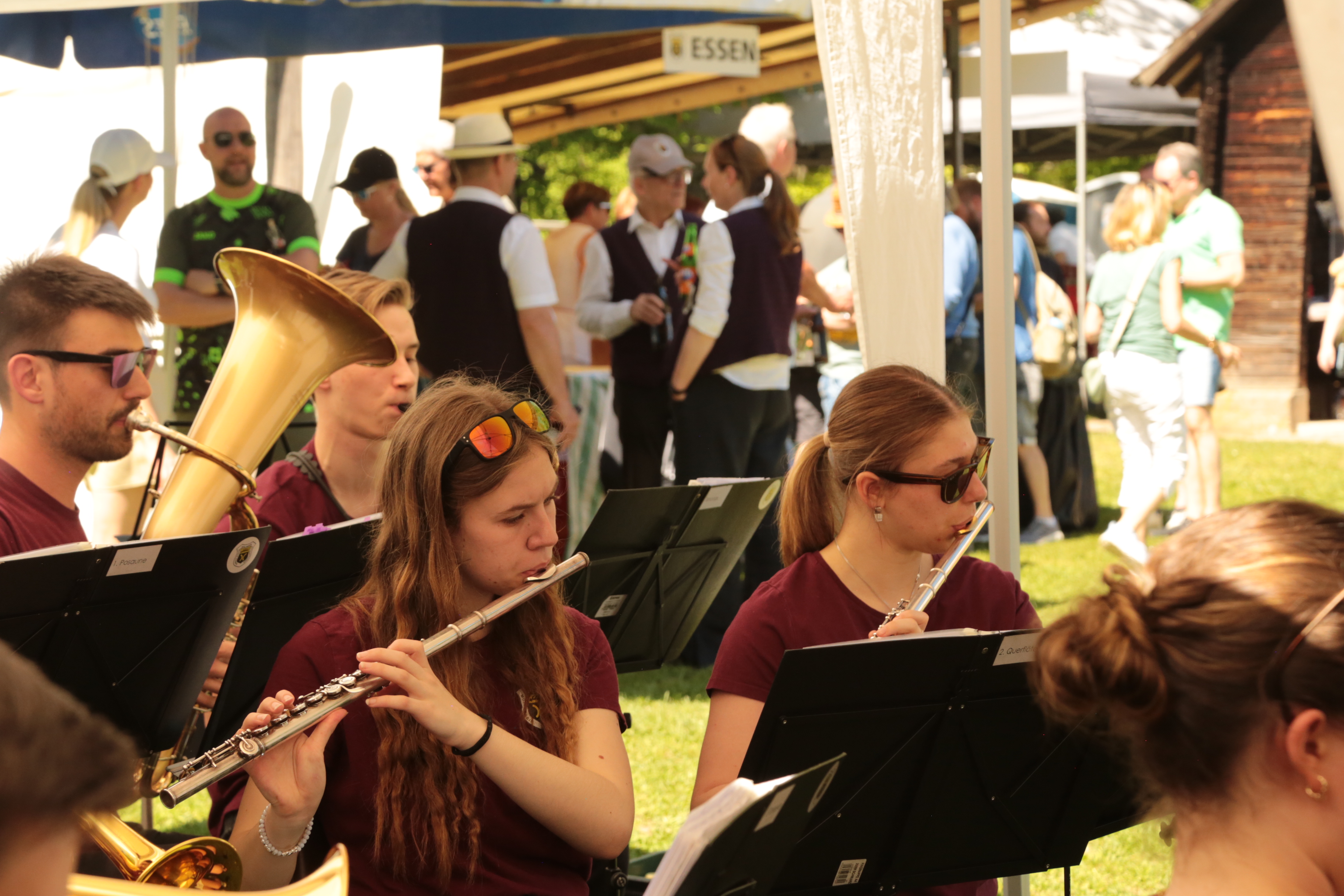 Na? Haben Sie es bemerkt? Korrekt, beide Kapellen des Musikvereins werden nun von Frauen dirigiert – so wie es der 1. Vorsitzende Matthias Widmann am diesjährigen Frühjahrskonzert angekündigt hat. Antonia Efinger hat die musikalische Eröffnung – und auch den Festausklang mit der Stadtkapelle geleitet. Unsere Jugendleiterin Leoni Hoffmann dirigiert die Jugendkapelle. Aber von vorne: Pünktlich um halb zwölf hat die Stadtkapelle den musikalischen Auftakt am Waldfest bei hochsommerlichen Randbedingungen gestartet. Passend mit dem Marsch „Die Sonne geht auf“. Im Anschluss nahm die Jugendkapelle Platz und führte die Unterhaltung der zahlreichen Besucher fort. Dank hervorragender Planung des Wirtschaftsteams um Miriam Storr konnten alle Besucher gestärkt die Wanderung oder die Radtour fortführen. Neben Pulled Pork wurde zu den Klassikern auch gegrillter Halloumi mit Tomate im Brötchen angeboten. Vielen Dank für alle die Mühen im Vorfeld, die für die meisten Besucher unsichtbar bleiben. Nach der Jugendkapelle hat die Stadtkapelle den musikalischen Ausklang übernommen – unter der Leitung von Antonia Efinger, der ein hervorragender Einstand gelungen ist. Herzlichen Glückwunsch.