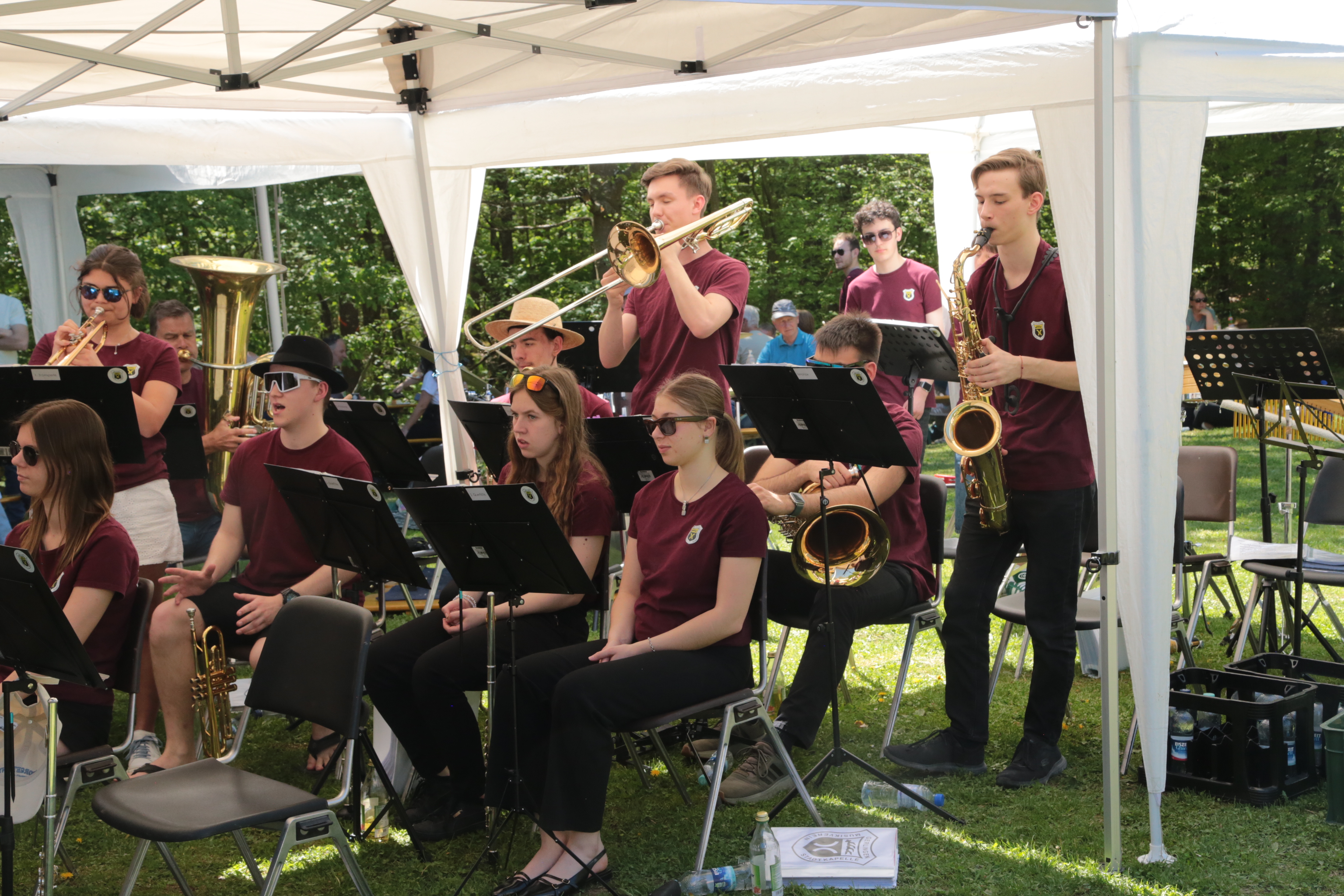 Na? Haben Sie es bemerkt? Korrekt, beide Kapellen des Musikvereins werden nun von Frauen dirigiert – so wie es der 1. Vorsitzende Matthias Widmann am diesjährigen Frühjahrskonzert angekündigt hat. Antonia Efinger hat die musikalische Eröffnung – und auch den Festausklang mit der Stadtkapelle geleitet. Unsere Jugendleiterin Leoni Hoffmann dirigiert die Jugendkapelle. Aber von vorne: Pünktlich um halb zwölf hat die Stadtkapelle den musikalischen Auftakt am Waldfest bei hochsommerlichen Randbedingungen gestartet. Passend mit dem Marsch „Die Sonne geht auf“. Im Anschluss nahm die Jugendkapelle Platz und führte die Unterhaltung der zahlreichen Besucher fort. Dank hervorragender Planung des Wirtschaftsteams um Miriam Storr konnten alle Besucher gestärkt die Wanderung oder die Radtour fortführen. Neben Pulled Pork wurde zu den Klassikern auch gegrillter Halloumi mit Tomate im Brötchen angeboten. Vielen Dank für alle die Mühen im Vorfeld, die für die meisten Besucher unsichtbar bleiben. Nach der Jugendkapelle hat die Stadtkapelle den musikalischen Ausklang übernommen – unter der Leitung von Antonia Efinger, der ein hervorragender Einstand gelungen ist. Herzlichen Glückwunsch.