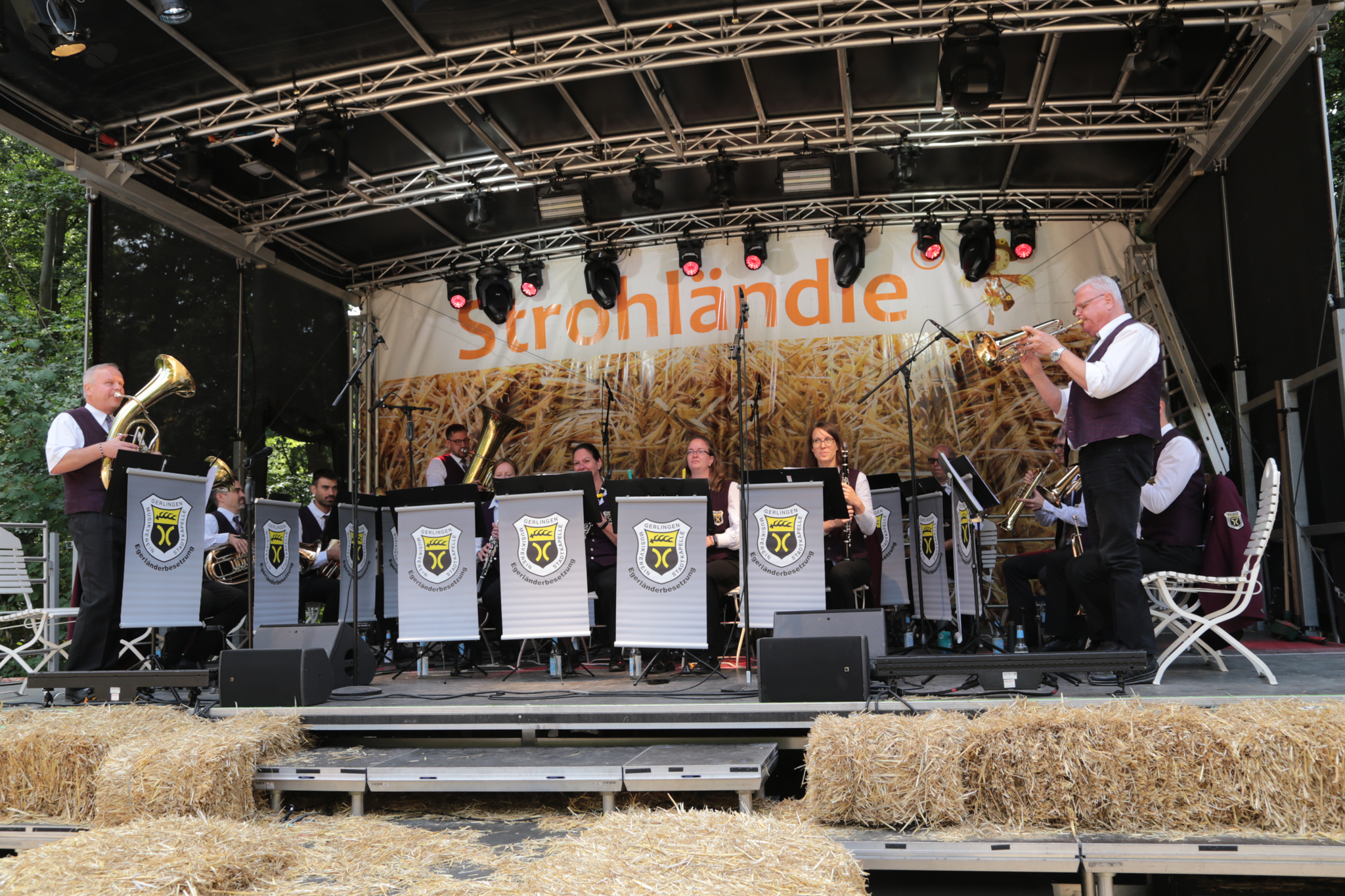 Na? Haben Sie es bemerkt? Korrekt, beide Kapellen des Musikvereins werden nun von Frauen dirigiert – so wie es der 1. Vorsitzende Matthias Widmann am diesjährigen Frühjahrskonzert angekündigt hat. Antonia Efinger hat die musikalische Eröffnung – und auch den Festausklang mit der Stadtkapelle geleitet. Unsere Jugendleiterin Leoni Hoffmann dirigiert die Jugendkapelle. Aber von vorne: Pünktlich um halb zwölf hat die Stadtkapelle den musikalischen Auftakt am Waldfest bei hochsommerlichen Randbedingungen gestartet. Passend mit dem Marsch „Die Sonne geht auf“. Im Anschluss nahm die Jugendkapelle Platz und führte die Unterhaltung der zahlreichen Besucher fort. Dank hervorragender Planung des Wirtschaftsteams um Miriam Storr konnten alle Besucher gestärkt die Wanderung oder die Radtour fortführen. Neben Pulled Pork wurde zu den Klassikern auch gegrillter Halloumi mit Tomate im Brötchen angeboten. Vielen Dank für alle die Mühen im Vorfeld, die für die meisten Besucher unsichtbar bleiben. Nach der Jugendkapelle hat die Stadtkapelle den musikalischen Ausklang übernommen – unter der Leitung von Antonia Efinger, der ein hervorragender Einstand gelungen ist. Herzlichen Glückwunsch.