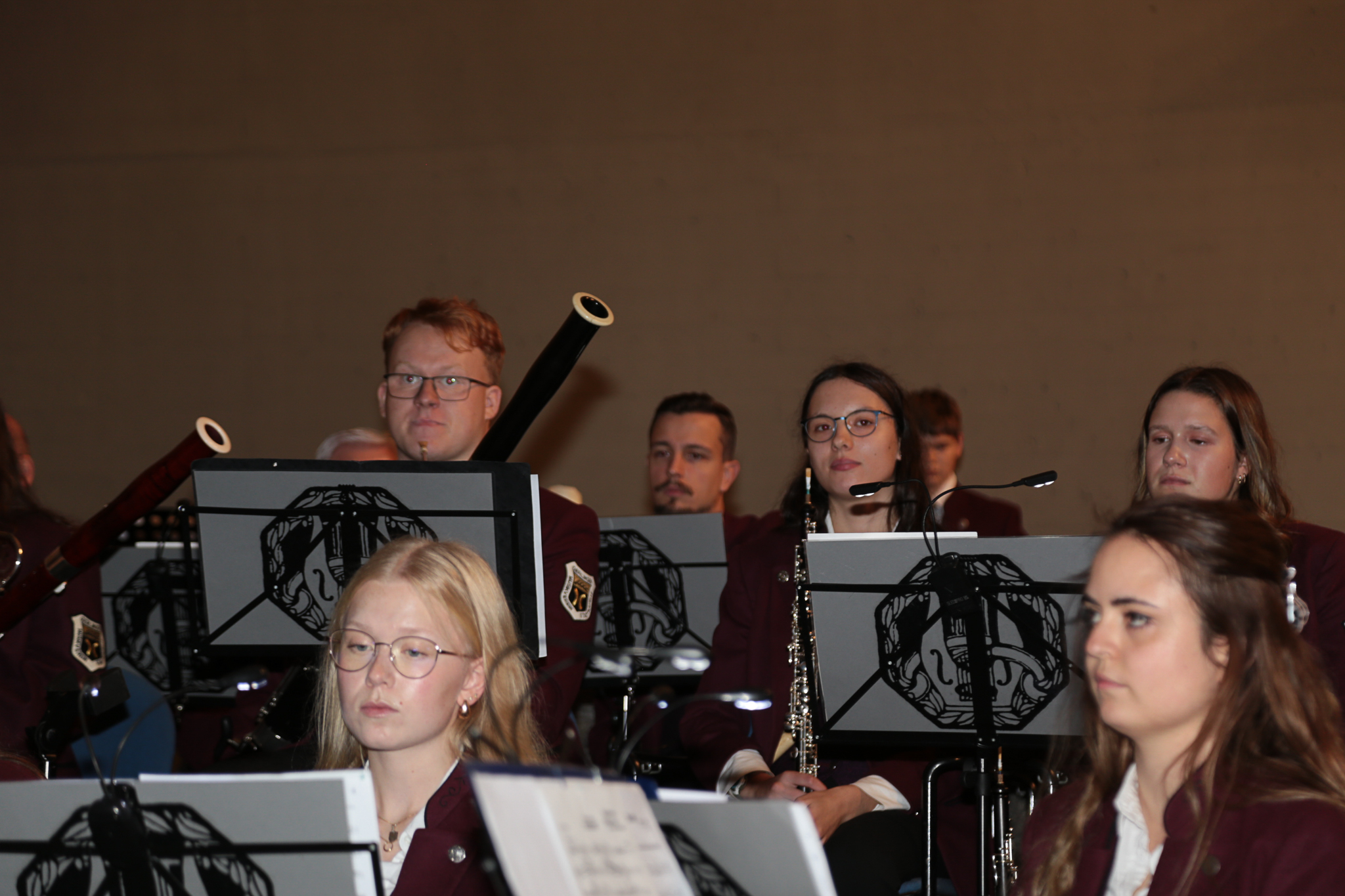 Nach der Pause setzte die Stadtkapelle den musikalischen Abend mit „Fat Bottomed Girls“ fort. Die musikalische Leitung hat Musikkamerad Herrmann Röser übernommen. Er hat die Nachfolge von Maximilian Broichhaus angetreten, bis ein neuer Dirigent für die Stadtkapelle gefunden ist. „Red Rock Mountain“, „Troll Dance“ und „First Suite“ waren weitere Titel, die gekonnt vorgetragen wurden. Mit unserem Solisten Markus Grieb am Flügelhorn wurde auch der nächste Titel „Someone Like You“ zu einem echten Gänsehauttitel. Mit „American Graffity“ und der „Almtaler Polka“ war das offizielle Konzertprogramm beendet. Doch der zahlreihe Applaus des Publikums ließ keine Verschnaufpause zu und mit „Roller Coaster“ wurde eine echte Achterbahnfahrt als Zugabe gespielt – natürlich mit dem typischen Kreischen bei der Abfahrt – hervorragend vom Publikum umgesetzt. Die finale Zugabe war der Titel „Füreinander da“, der von den Hutter-Brüdern komponiert wurde. Dieses Stück wurde gemeinsam mit der JuKa gespielt, so dass über 70 Musiker auf der Bühne standen. Was für ein gewaltiges Bild.