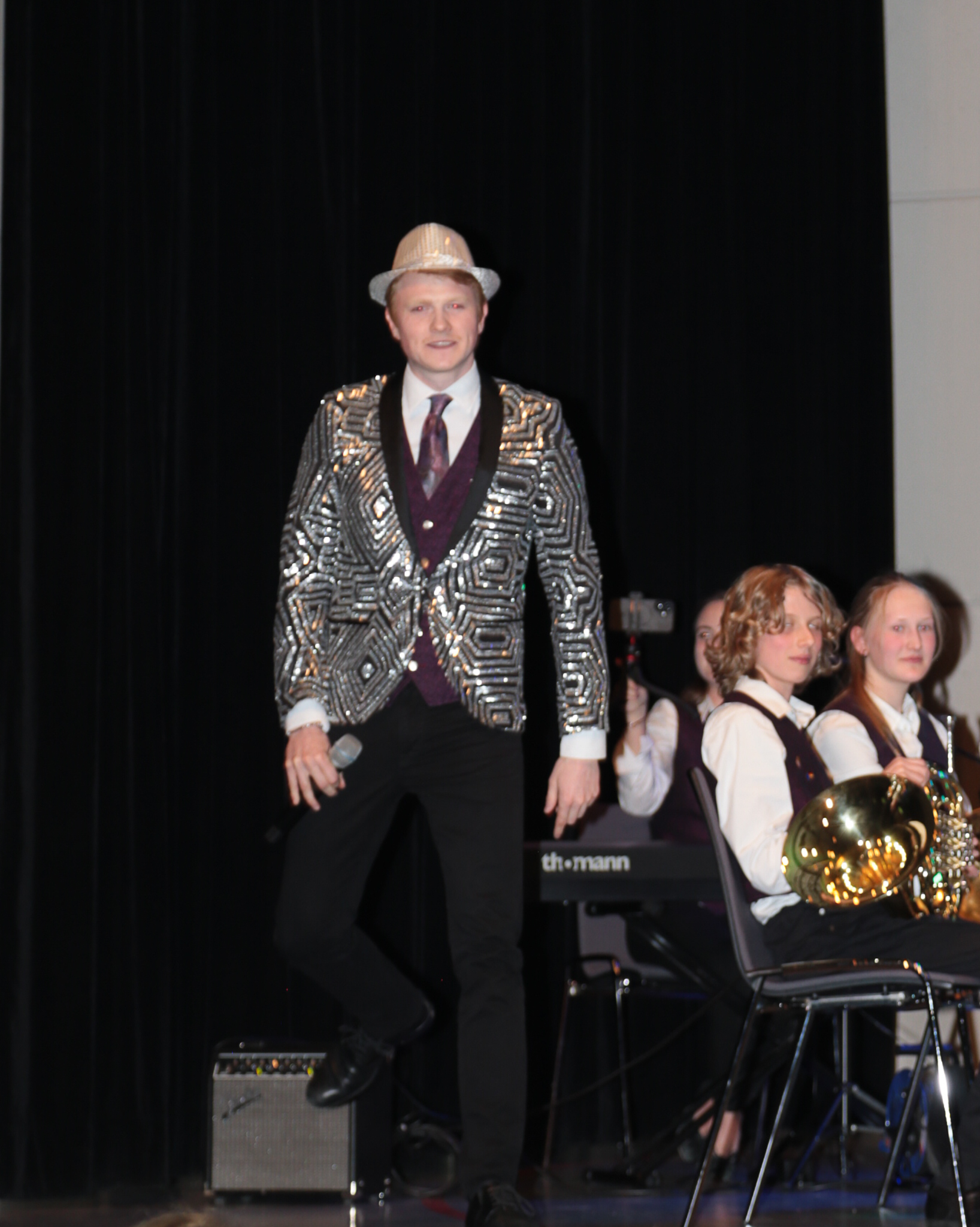 Der offiziell letzte Titel der JuKa unter der Leitung von Leoni Hoffmann ist im wahrsten Sinne des Wortes „Programm: „Let Me Entertain You“ – ein Medley von Robbie Williams’ größten Hits. Dass die Jugendkapelle auch Entertainment versteht beweist Erik Laicher, der im Vorfeld in typischer Showmaster-Manier die Menge in der Stadthalle richtig in Stimmung bringt. Hunderte Leuchtstäbe in den Händen der Besucher und Lichteffekte einer riesigen Discokugel an Wänden und Decke der Halle sorgen bei dem Titel „Angels“ für Gänsehaut und echtes Konzertfeeling.