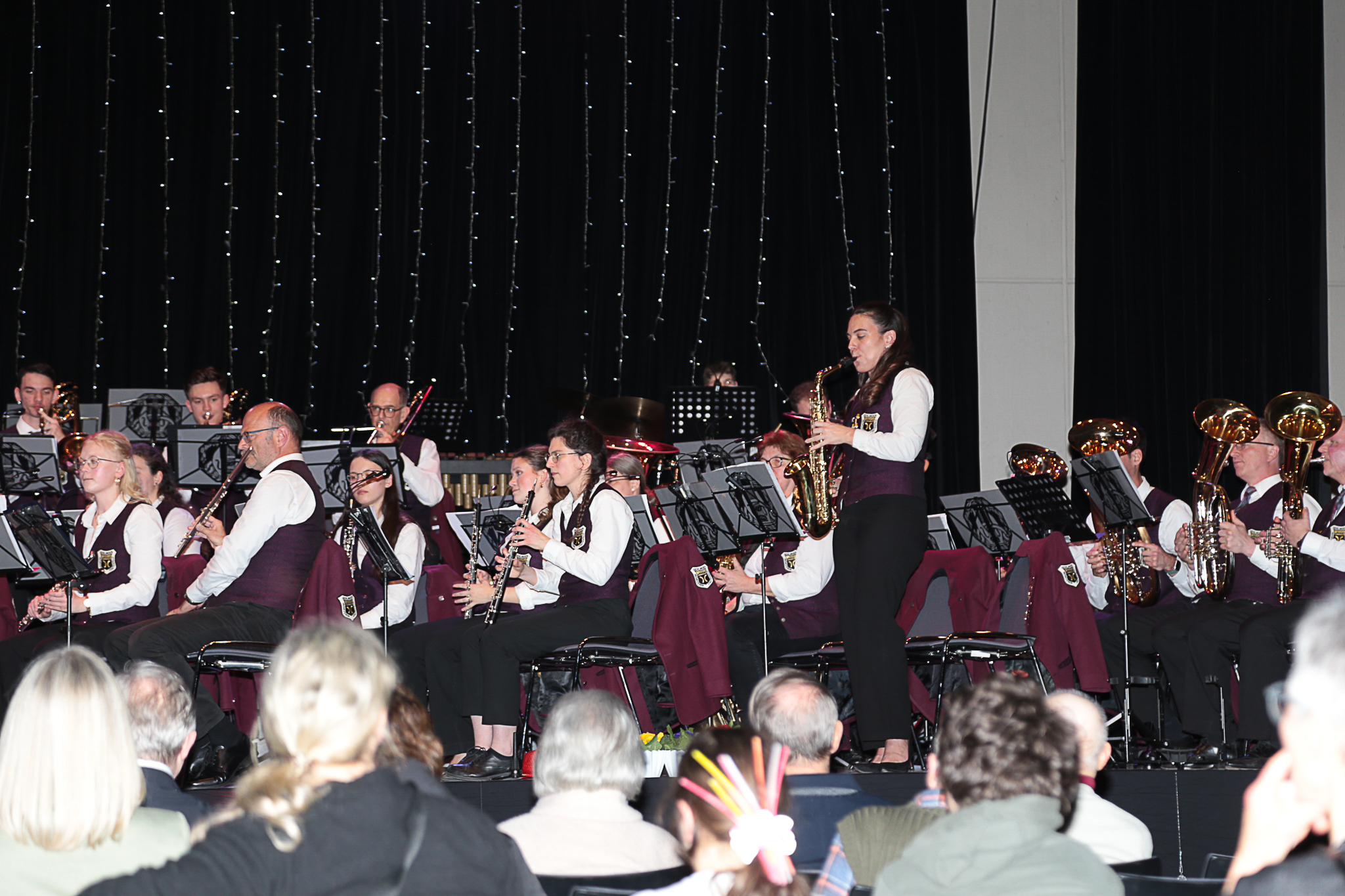 Der offiziell letzte Titel der JuKa unter der Leitung von Leoni Hoffmann ist im wahrsten Sinne des Wortes „Programm: „Let Me Entertain You“ – ein Medley von Robbie Williams’ größten Hits. Dass die Jugendkapelle auch Entertainment versteht beweist Erik Laicher, der im Vorfeld in typischer Showmaster-Manier die Menge in der Stadthalle richtig in Stimmung bringt. Hunderte Leuchtstäbe in den Händen der Besucher und Lichteffekte einer riesigen Discokugel an Wänden und Decke der Halle sorgen bei dem Titel „Angels“ für Gänsehaut und echtes Konzertfeeling.