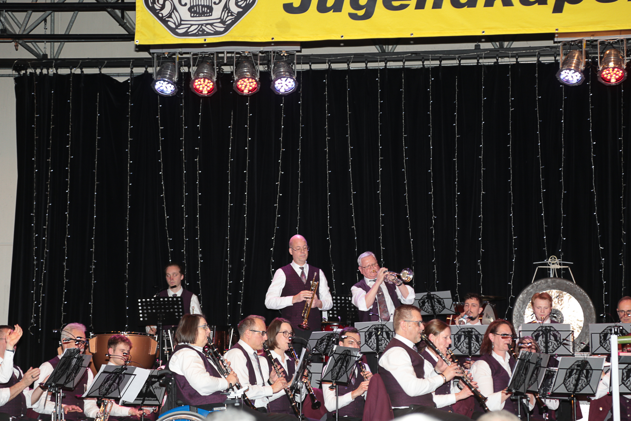 Der offiziell letzte Titel der JuKa unter der Leitung von Leoni Hoffmann ist im wahrsten Sinne des Wortes „Programm: „Let Me Entertain You“ – ein Medley von Robbie Williams’ größten Hits. Dass die Jugendkapelle auch Entertainment versteht beweist Erik Laicher, der im Vorfeld in typischer Showmaster-Manier die Menge in der Stadthalle richtig in Stimmung bringt. Hunderte Leuchtstäbe in den Händen der Besucher und Lichteffekte einer riesigen Discokugel an Wänden und Decke der Halle sorgen bei dem Titel „Angels“ für Gänsehaut und echtes Konzertfeeling.