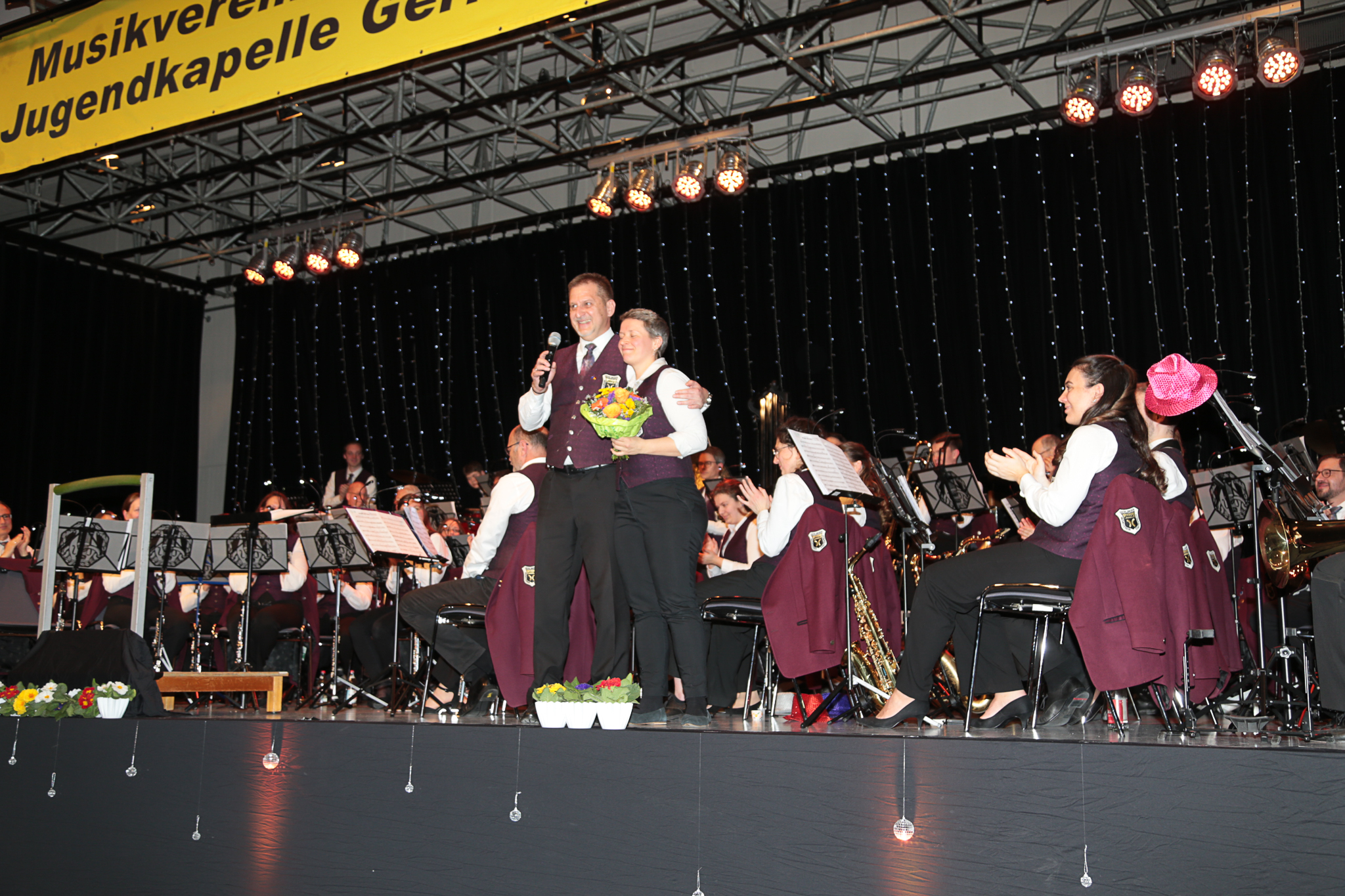 Der offiziell letzte Titel der JuKa unter der Leitung von Leoni Hoffmann ist im wahrsten Sinne des Wortes „Programm: „Let Me Entertain You“ – ein Medley von Robbie Williams’ größten Hits. Dass die Jugendkapelle auch Entertainment versteht beweist Erik Laicher, der im Vorfeld in typischer Showmaster-Manier die Menge in der Stadthalle richtig in Stimmung bringt. Hunderte Leuchtstäbe in den Händen der Besucher und Lichteffekte einer riesigen Discokugel an Wänden und Decke der Halle sorgen bei dem Titel „Angels“ für Gänsehaut und echtes Konzertfeeling.
