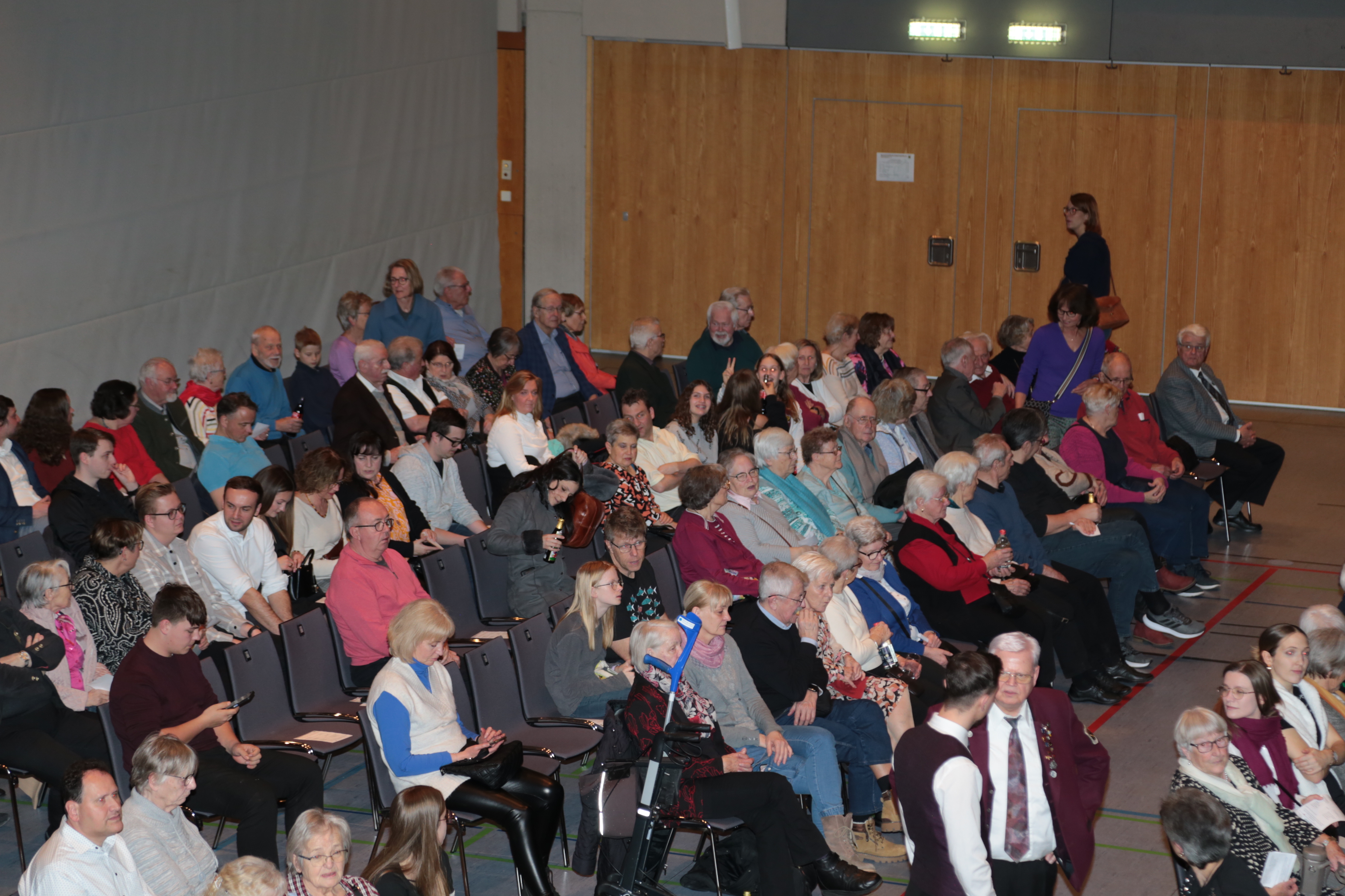 Gewohnt souverän startete die ca. 30-köpfige Jugendkapelle den musikalischen Abend mit „Panta Rhei“, was übersetzt so viel wie „Alles fließt“ bedeutet. Im Anschluss wurde dem Publikum die Filmmusik aus „Drachenzähmen leicht gemacht“ unter dem Titel „How to train your Dragon“ präsentiert. Mit dem folgenden Titel „Baba Yetu“ kündigte Sonja Laicher den offiziell letzten Titel der Juka an. An dieser Stelle „herzlichen Dank“ an Sonja, die die Moderation von Matthias Widmann übernommen hat. Nach der anschließenden Zugabe nahm die Stadtkapelle mit knapp 60 Musiker auf der Bühne Platz. Dank einer sehr guten Zusammenarbeit mit der Jugendmusikschule ist es dem Musikverein möglich, eine vergleichsweise große Stadtkapelle zu präsentieren, die regelmäßig mit Jugendlichen aus der Juka verstärkt wird. „Darauf bin ich wirklich stolz“, so Matthias Widmann in seiner Ansprache. Im Anschluss an die ersten Titel „Schwabenland“ und „Königsmarsch“ ging es in eine kleine Pause, die für Erfrischungen und kleine Gespräche genutzt wurde. Mit „Arsenal“ und „Mont Blanc“ ging es nach der Pause fulminant weiter. Fulminant deshalb, da bei „Mont Blanc“ neben Vogelgezwitscher auch Lawinenabgänge musikalisch umgesetzt wurden. Ruhiger ging es in den nachfolgenden Stücken „Adele 21“ und „Out of Africa“ zur Sache. Mit „Oregon“ endete das erste Frühjahrskonzert unter der musikalischen Leitung von Maximilian Broichhaus. Dem Wunsch des Publikums nach einer Zugabe sind wir gerne gefolgt und beendeten das Konzert mit der Polka „Böhmisch klingt’s am Schönsten“. Unser Wirtschaftsteam um Miriam Storr haben mal wieder frisch zubereitete Köstlichkeiten vorbereitet, was vom zahlreichen Publikum sehr gut angenommen wurde.