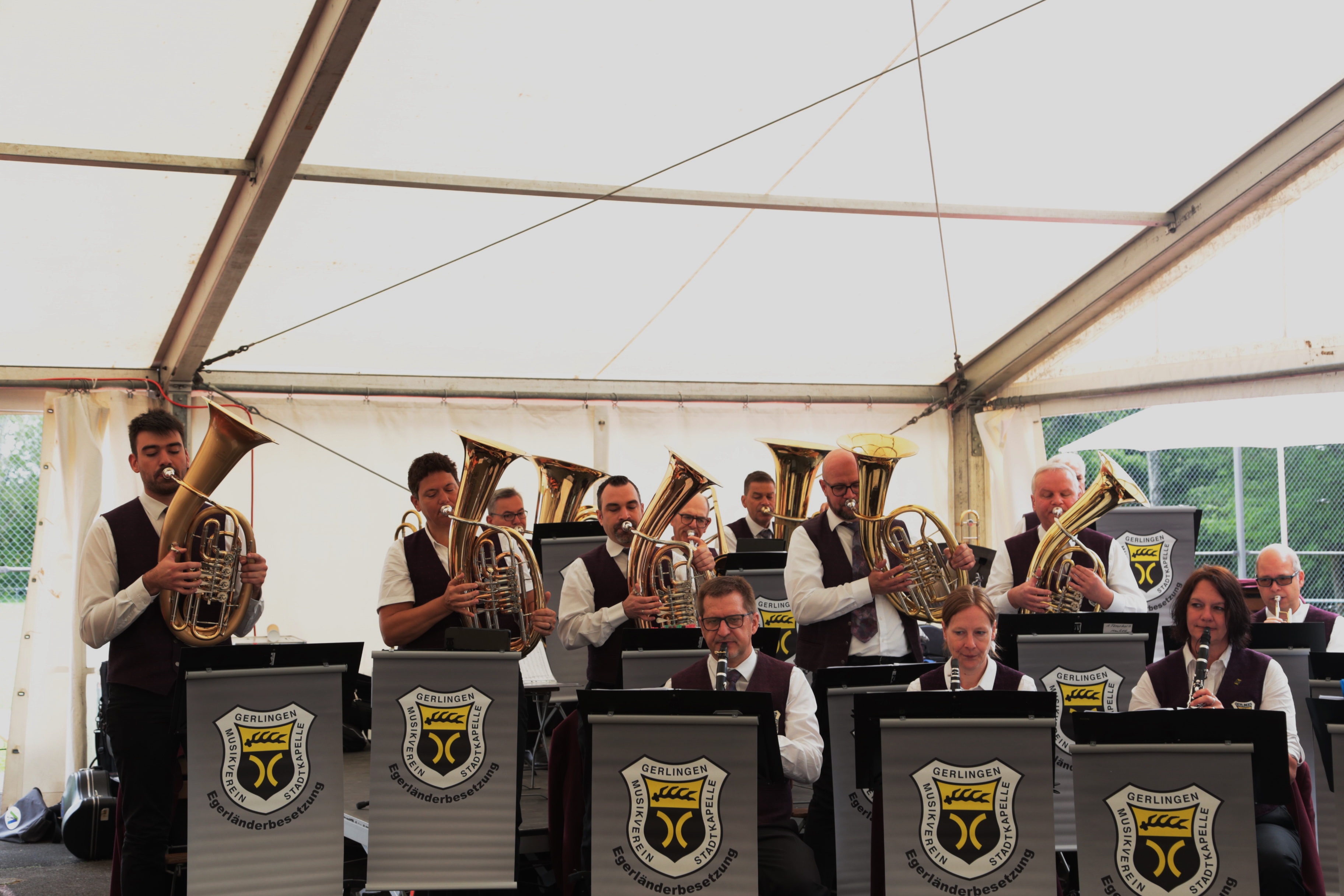 Am Sonntag, 5. Mai spielte die Egerländer Besetzung des Musikverein Gerlingens zum Frühschoppen beim Feuerbacher Göckelesfest auf. In drei Stunden wurden abwechselnd böhmische Blasmusik, moderne Arrangements und solistische Stücke präsentiert. Unser musikalischer Leiter Peter Gerl sorgte so für ein abwechselndes Programm, bei dem auch das ein oder andere Gesangsstück wie „Auf der Vogelwiese“ auf der Setlist stand. Speziell die solistischen Stücke wie „My Way“ oder eine moderne Version von „Hey Jude“ präsentiert kamen besonders gut beim Publikum an. Letzteres wurde von unserem Posaunisten Hermann Röser neu arrangiert, der auch das Posaunensolo übernommen hat. Unvergessen auch „My Dream“, beim dem unser Trompeter Markus Grieb das Stück einfach mal auswendig spielt.
