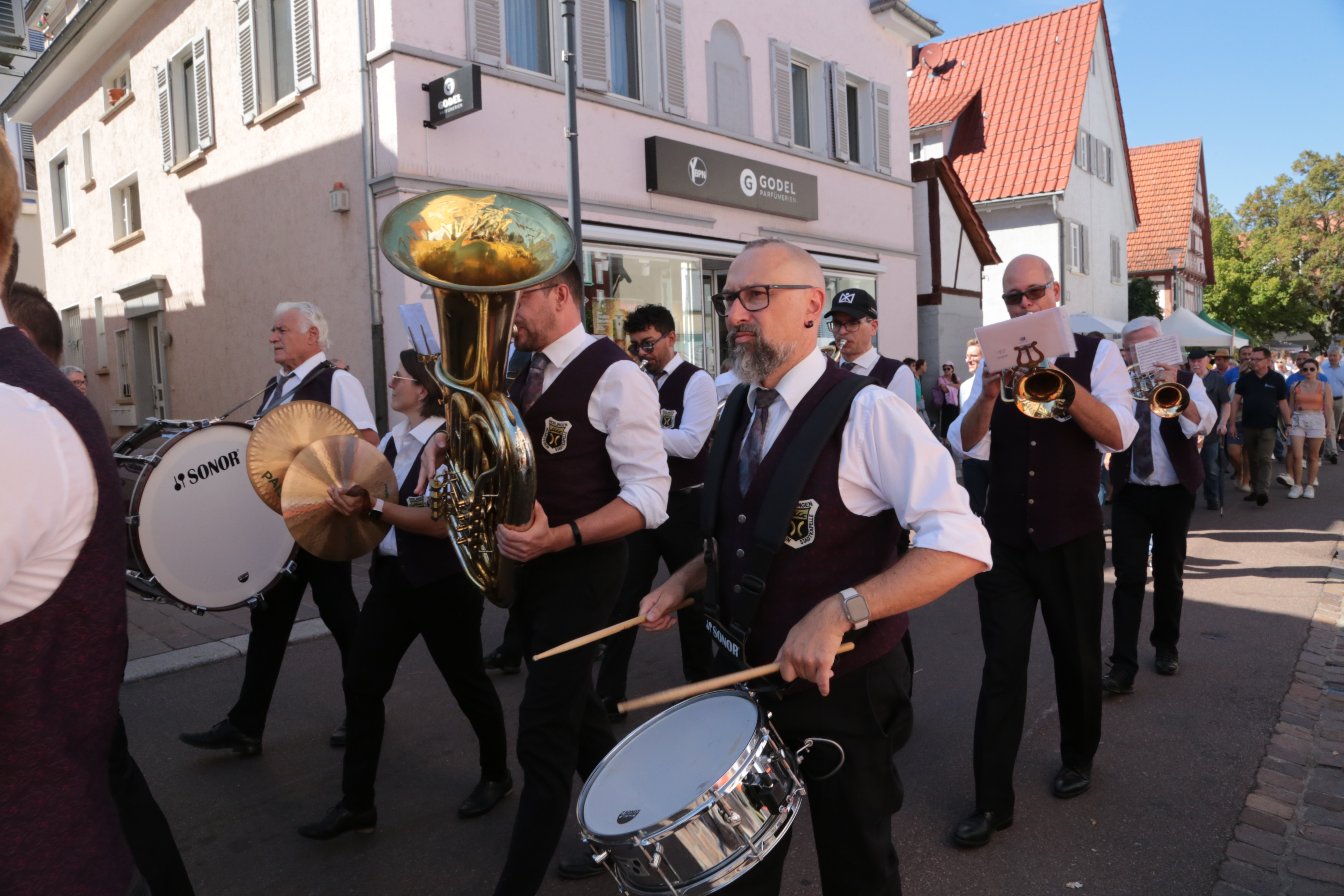 Am Sonntag, 5. Mai spielte die Egerländer Besetzung des Musikverein Gerlingens zum Frühschoppen beim Feuerbacher Göckelesfest auf. In drei Stunden wurden abwechselnd böhmische Blasmusik, moderne Arrangements und solistische Stücke präsentiert. Unser musikalischer Leiter Peter Gerl sorgte so für ein abwechselndes Programm, bei dem auch das ein oder andere Gesangsstück wie „Auf der Vogelwiese“ auf der Setlist stand. Speziell die solistischen Stücke wie „My Way“ oder eine moderne Version von „Hey Jude“ präsentiert kamen besonders gut beim Publikum an. Letzteres wurde von unserem Posaunisten Hermann Röser neu arrangiert, der auch das Posaunensolo übernommen hat. Unvergessen auch „My Dream“, beim dem unser Trompeter Markus Grieb das Stück einfach mal auswendig spielt.