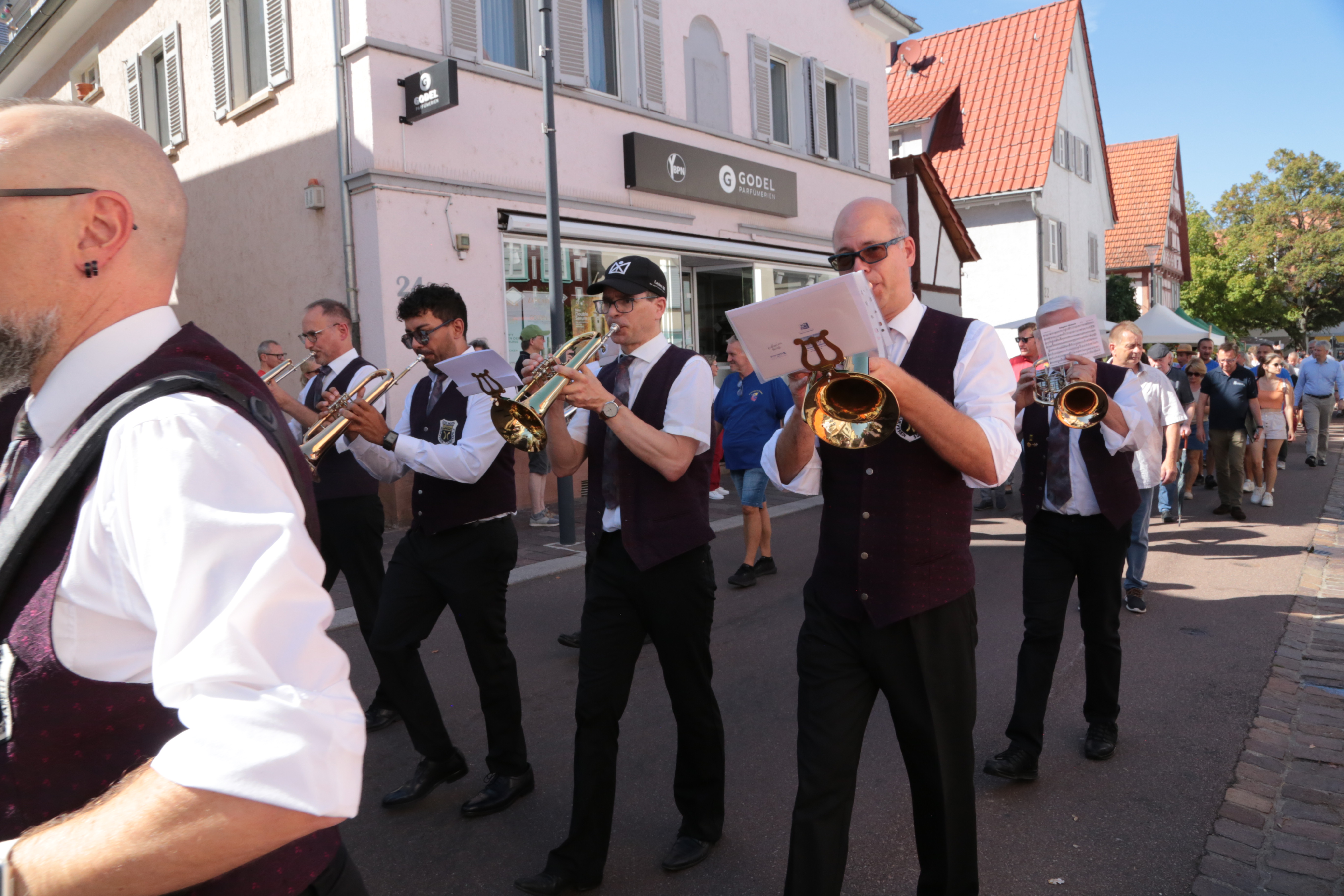 Am Sonntag, 5. Mai spielte die Egerländer Besetzung des Musikverein Gerlingens zum Frühschoppen beim Feuerbacher Göckelesfest auf. In drei Stunden wurden abwechselnd böhmische Blasmusik, moderne Arrangements und solistische Stücke präsentiert. Unser musikalischer Leiter Peter Gerl sorgte so für ein abwechselndes Programm, bei dem auch das ein oder andere Gesangsstück wie „Auf der Vogelwiese“ auf der Setlist stand. Speziell die solistischen Stücke wie „My Way“ oder eine moderne Version von „Hey Jude“ präsentiert kamen besonders gut beim Publikum an. Letzteres wurde von unserem Posaunisten Hermann Röser neu arrangiert, der auch das Posaunensolo übernommen hat. Unvergessen auch „My Dream“, beim dem unser Trompeter Markus Grieb das Stück einfach mal auswendig spielt.