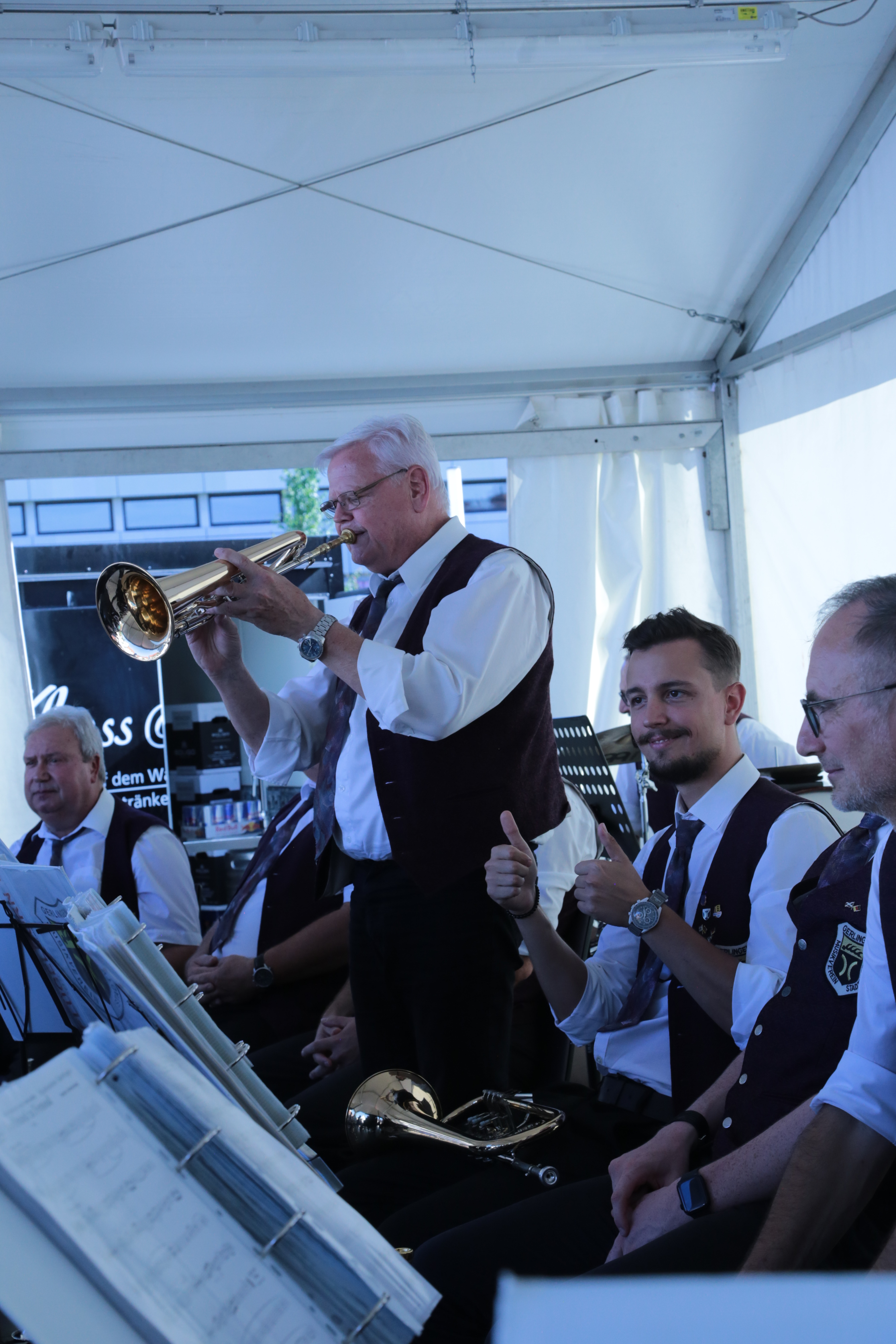 Im Anschluss an den Auftritt gab es von der Sportvereinigung noch ein leckeres Mittagessen mit einem passenden, kühlen Getränk dazu. Herzlichen Dank für die herrliche Bewirtung und für die musikalische Gestaltung des Frühschoppens. Wir kommen gerne wieder – es war ein toller Sonntag im Zelt.